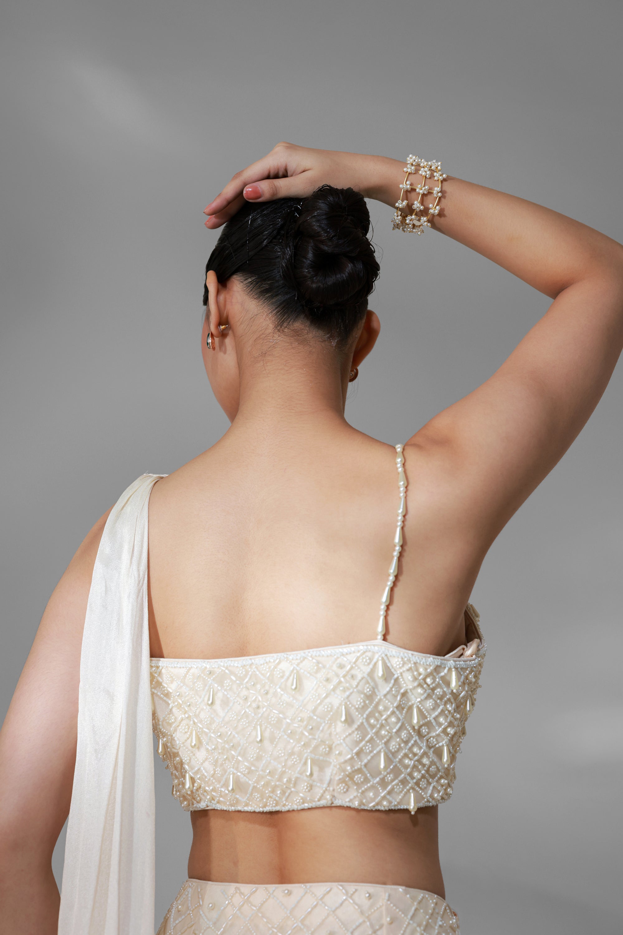 – Dupatta: Signature pearl-front drape, turning into fabric fall at the back