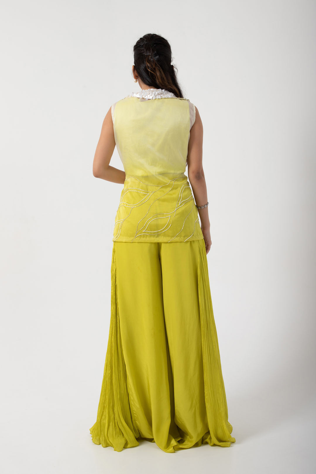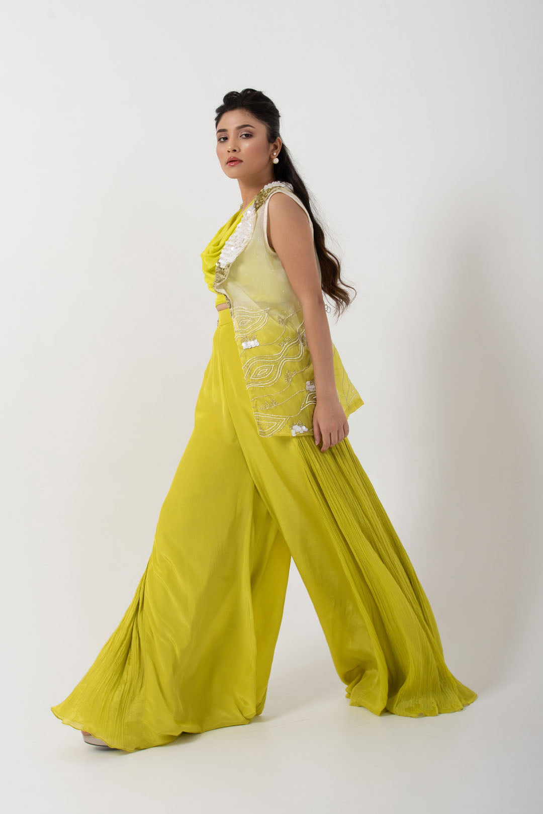 This stylish ensemble features a black bustier top with applique work, paired with an elegant drape skirt. complete with a short cape for a chic finish.