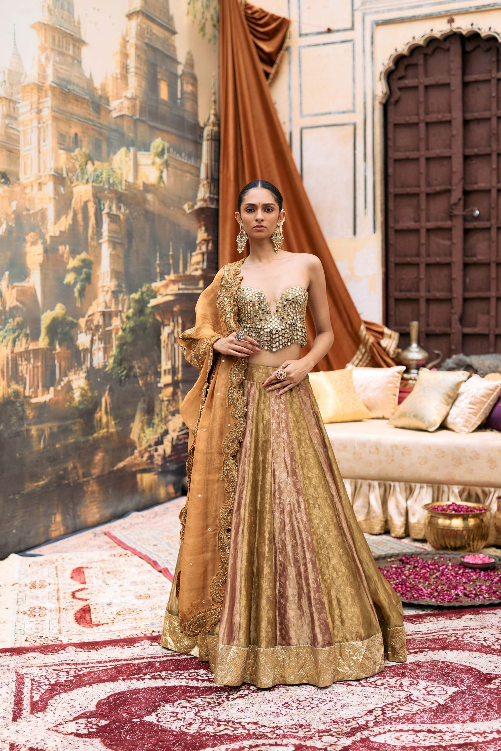- Silhouette: Flared plum-gold lehenga paired with a fitted mirror corset and flowing dupatta