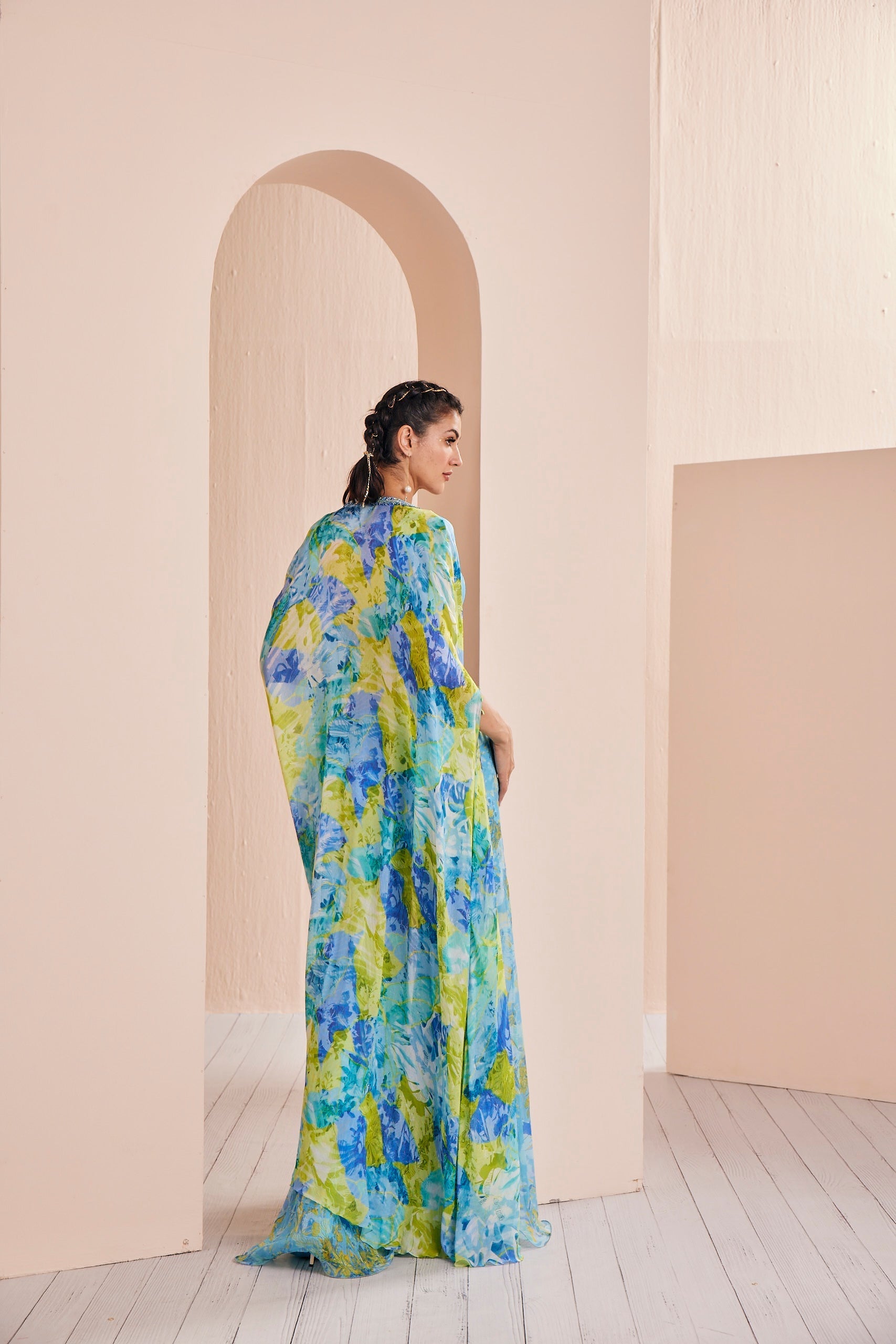 Paired with it is a panelled sharara, offering both comfort and style in one. Completing the ensemble is a graceful cape, adorned with delicate neck embroidery, adding an extra layer of sophistication. This outfit effortlessly combines tradition and contemporary design, making it a captivating choice for any special occasion.