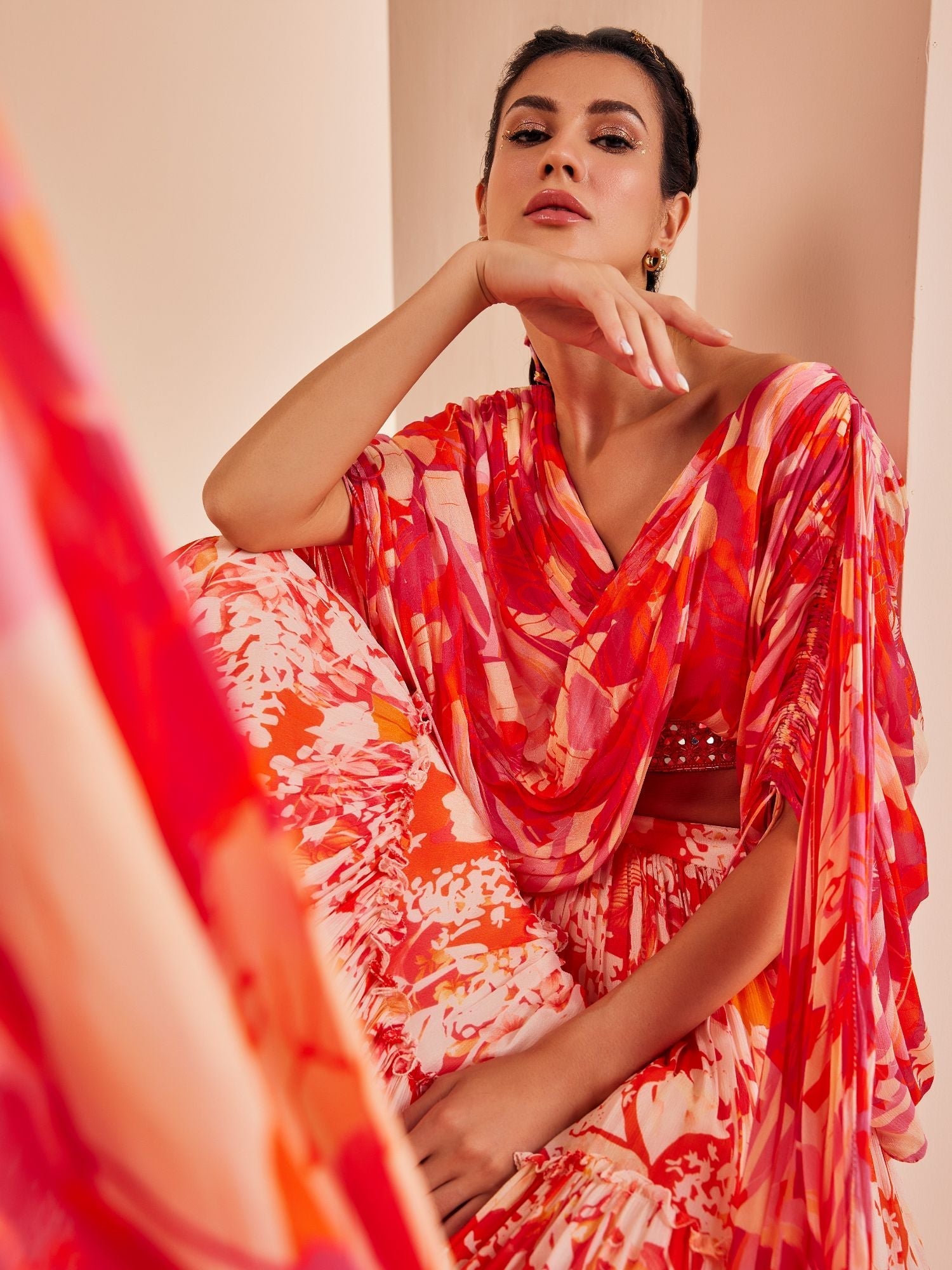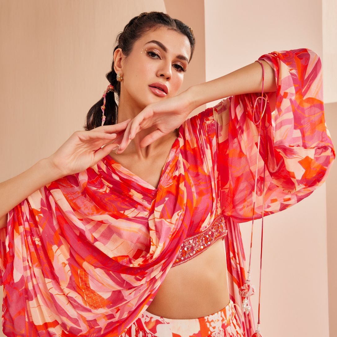 Intricately designed, this ensemble is a testament to thoughtful craftsmanship and creative design. The delicate chiffon blouse is adorned with a captivating print, and its stylized draped design is complemented by a distinctive rushed sleeve and a gracefully flowing back trail, adding a touch of drama to the overall look.