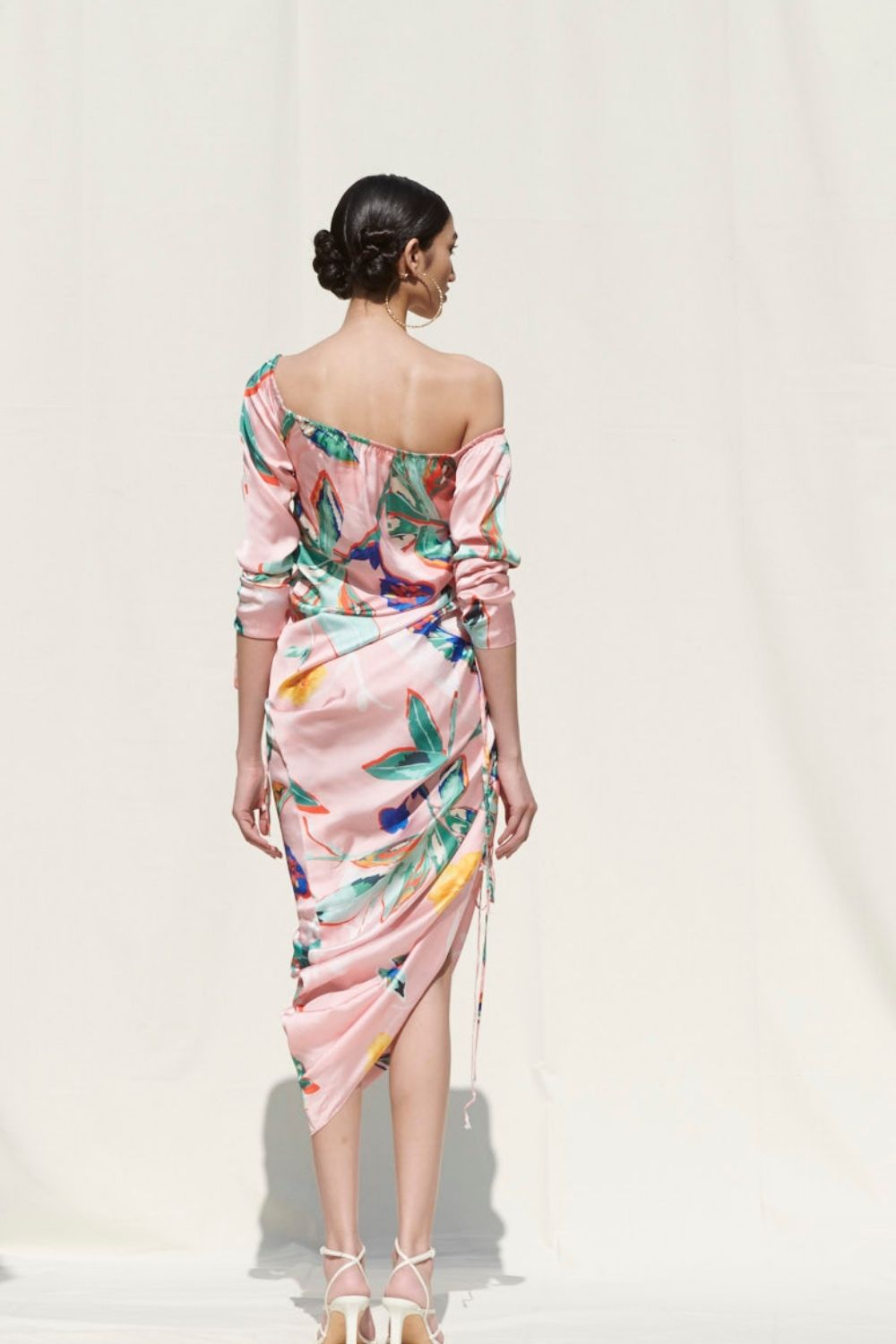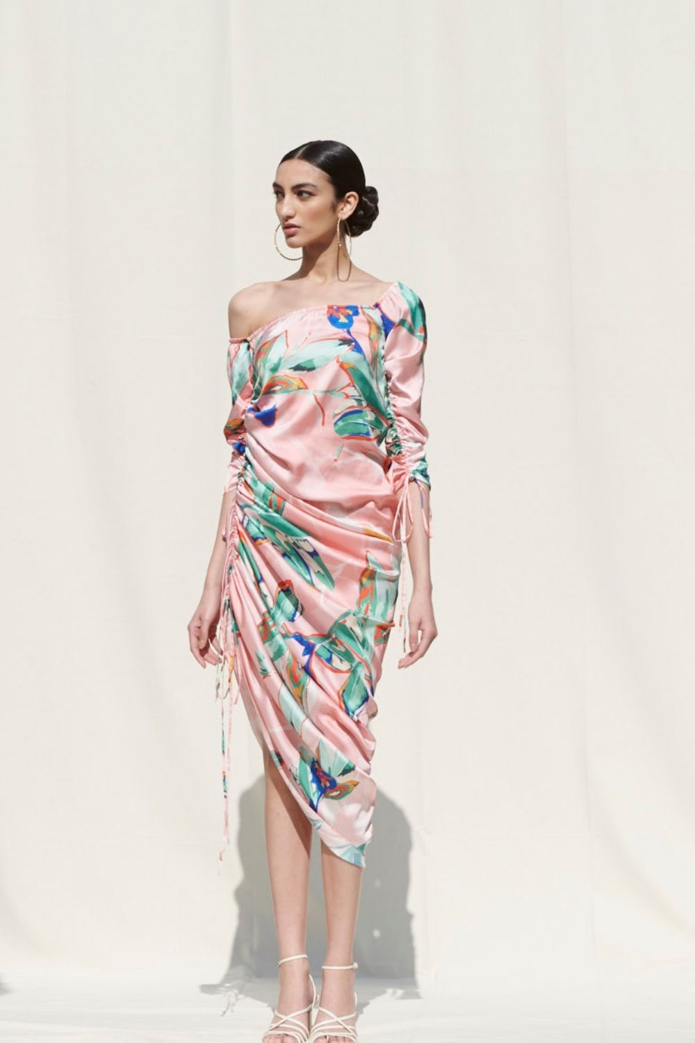 Printed Crepe Satin One Shoulder Dress With Side Gather And Strings Details. What truly sets this dress apart are the side gathers and string details. These add a unique and fashion-forward element to your look, creating a captivating and artful effect that makes this dress stand out.