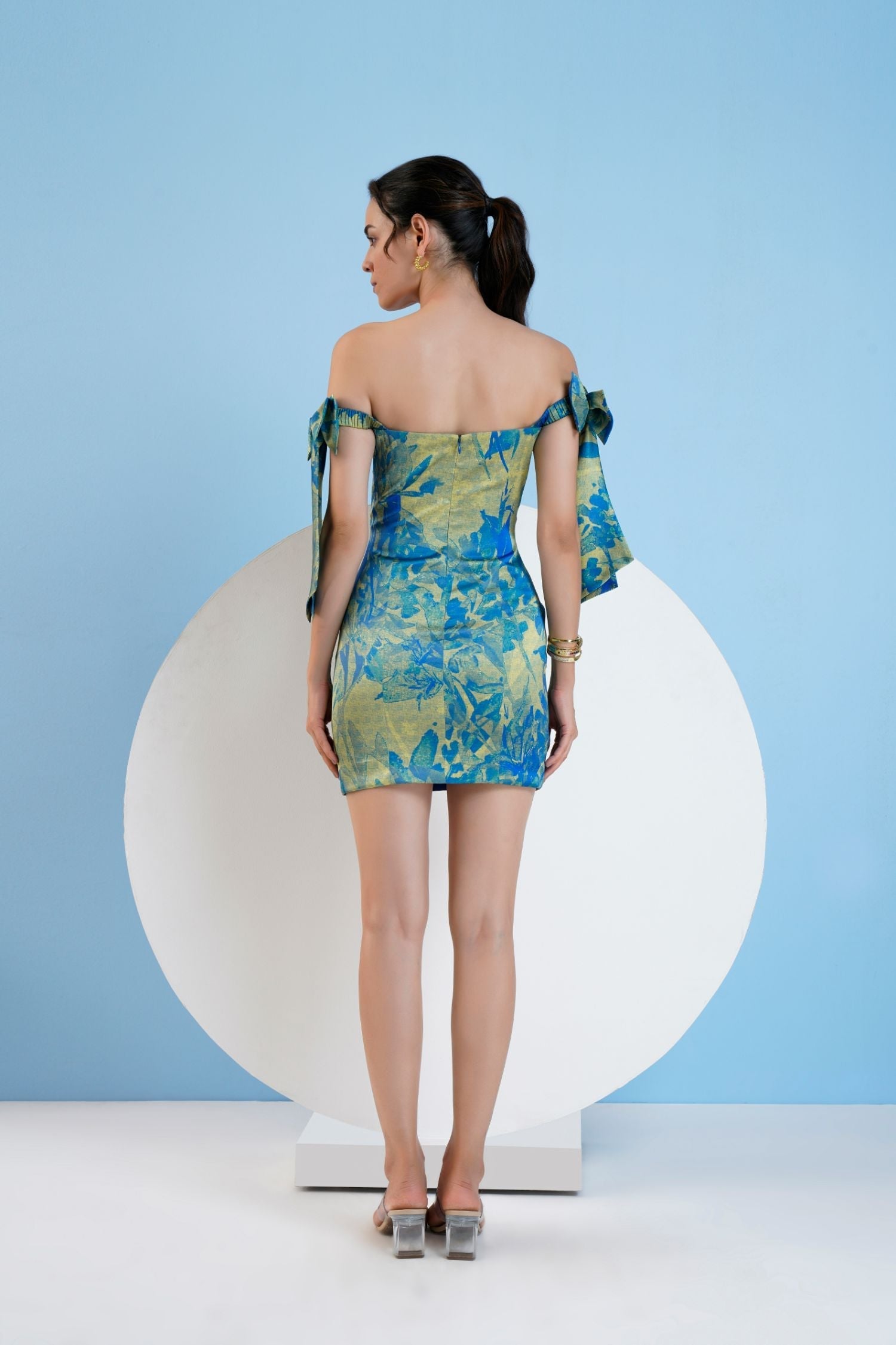 Featuring gold foil botanical foliage printed short fitted dress in satin with knotted elastic straps, cutout, puff sleeves, and a hand-embroidered collar.