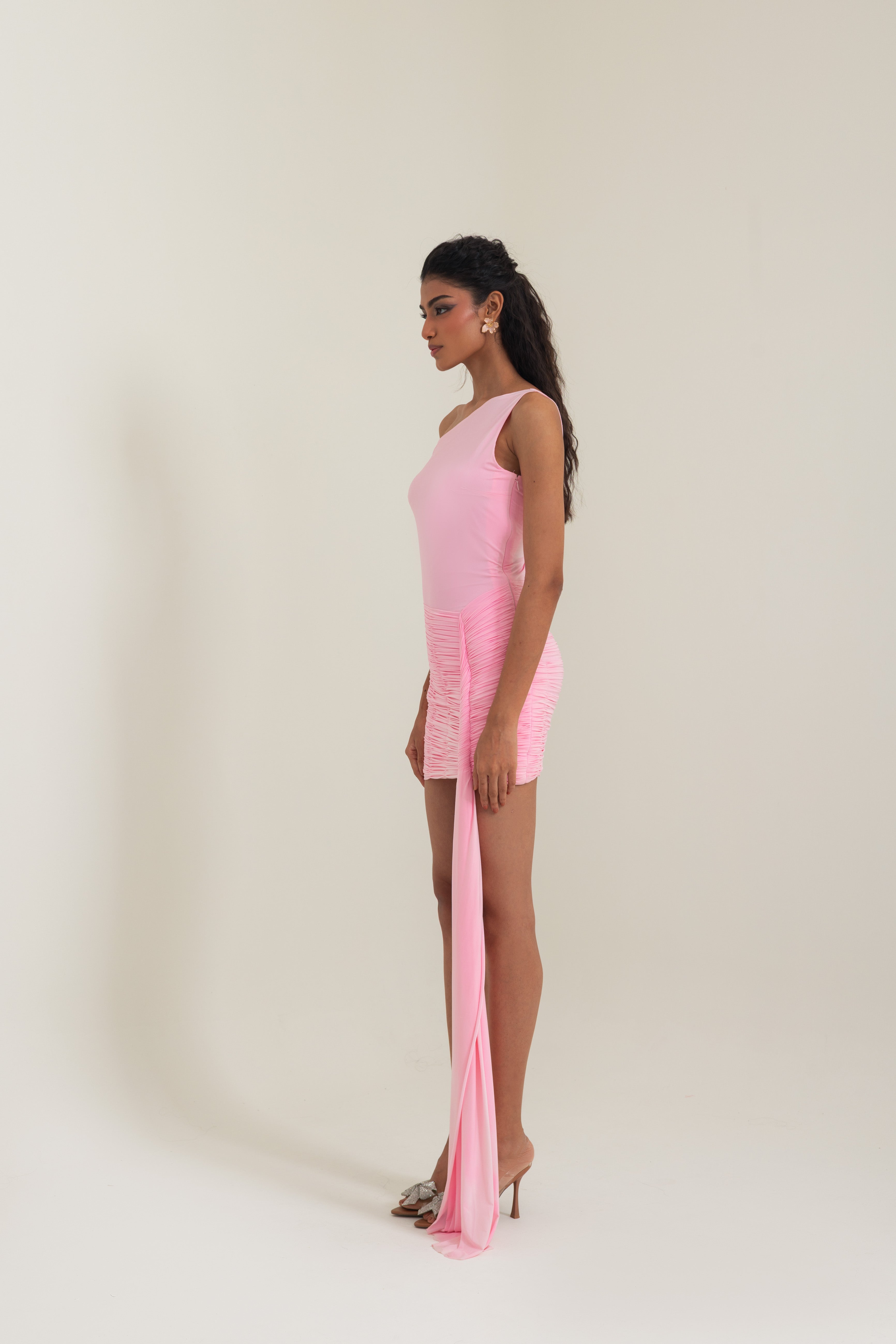 Sculpted in luxe lycra, this blush pink mini dress exudes contemporary glamour with its sleek, body-skimming silhouette. The design features a bold one-shoulder neckline with an asymmetric sleeve, striking the perfect balance between elegance and edge.