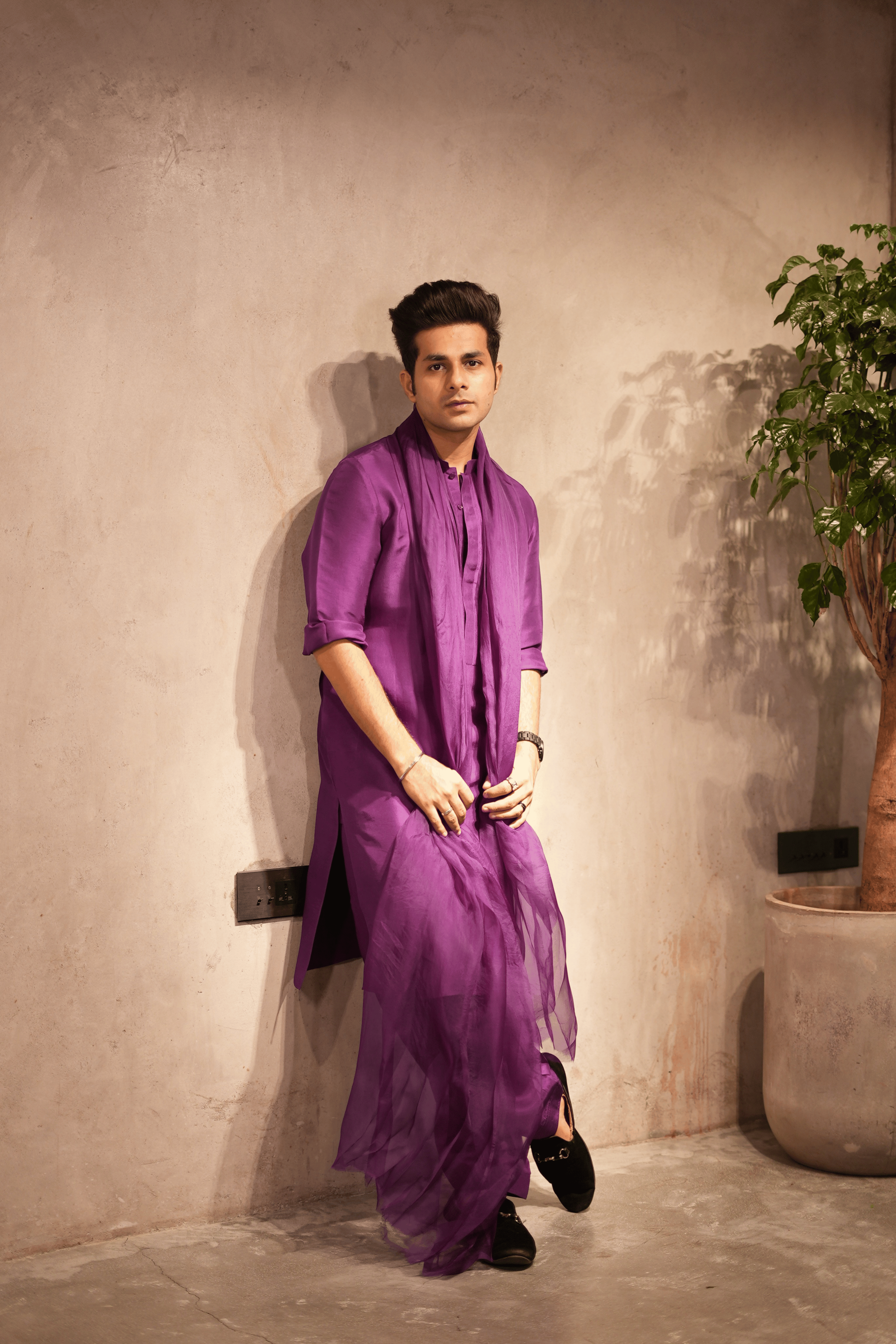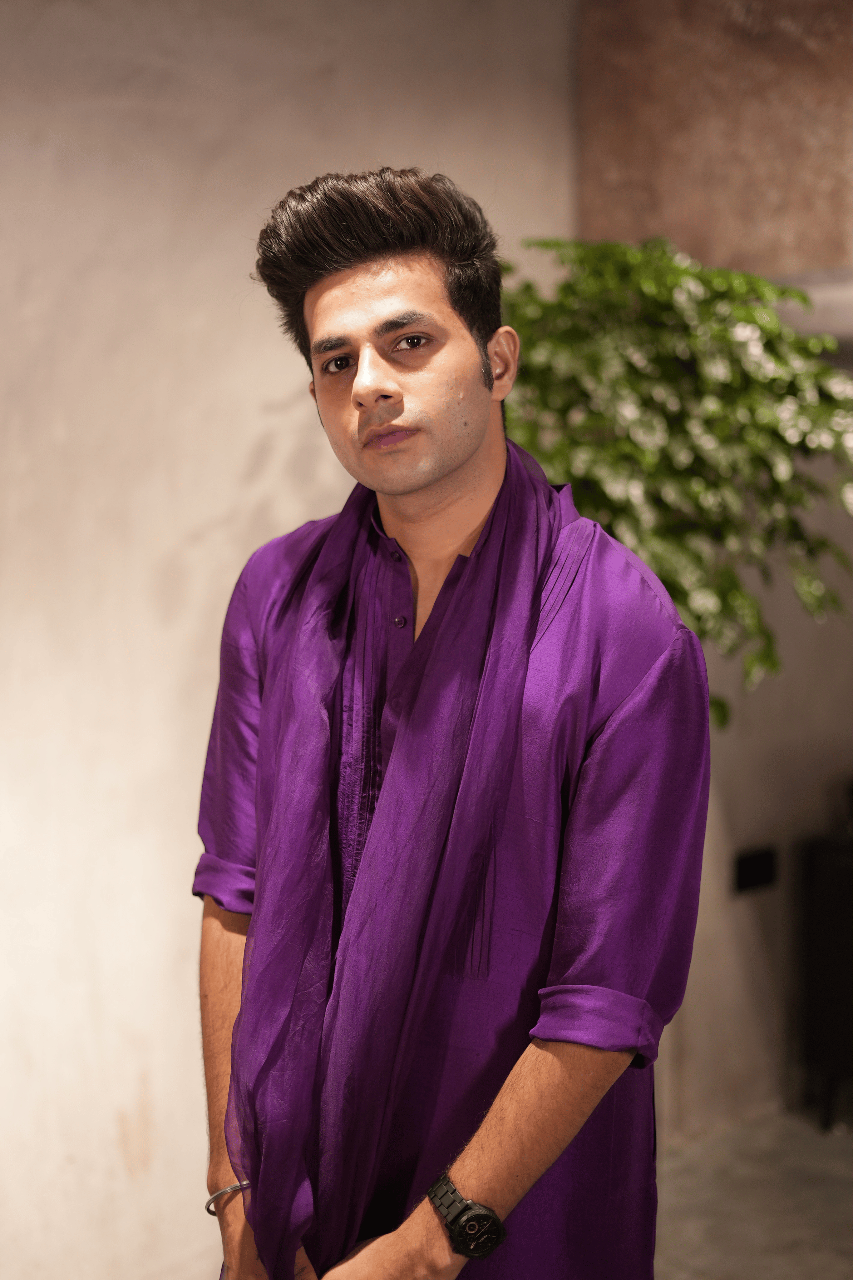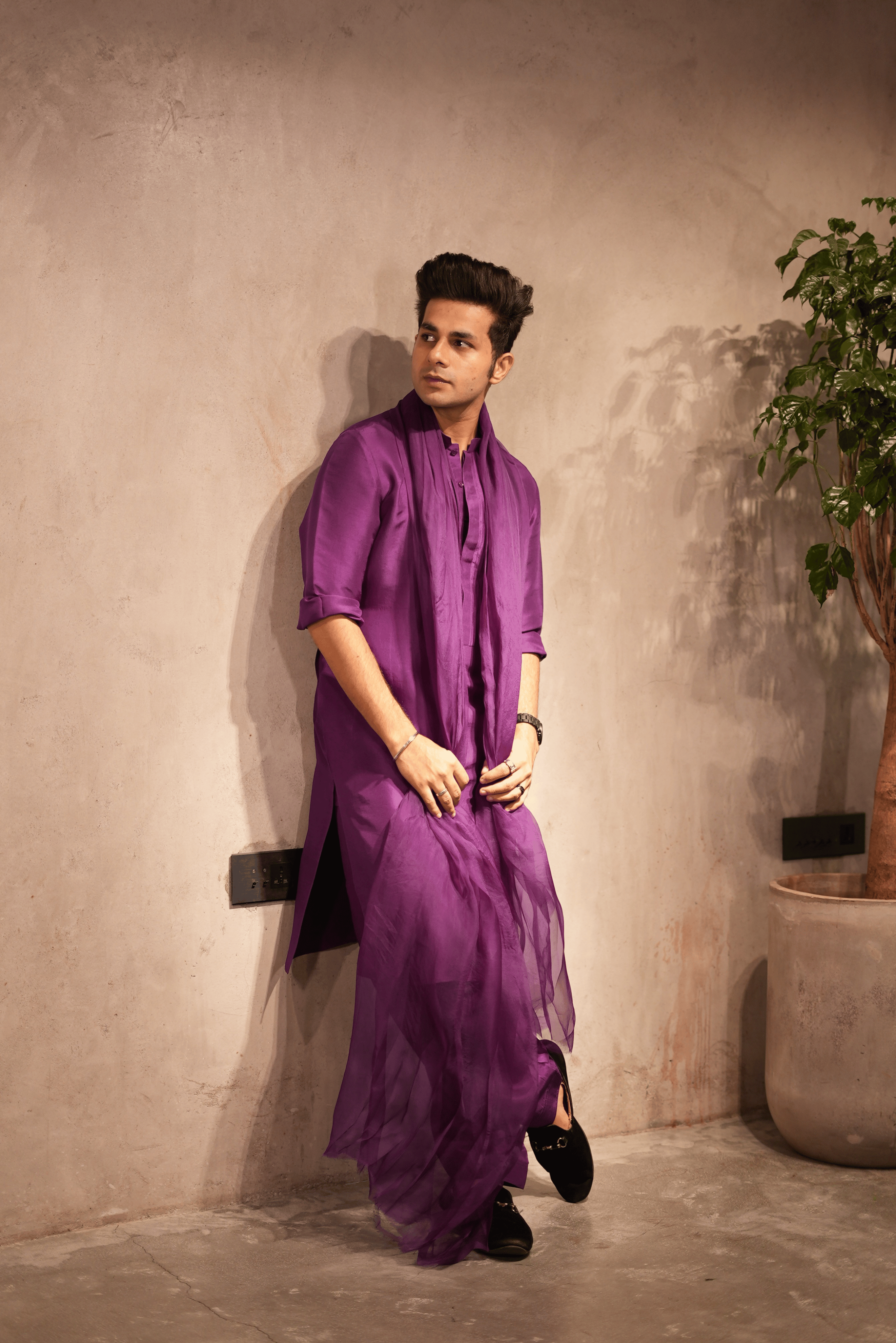 A refined choice for festive celebrations or wedding events, this purple silk kurta set features pleated detailing for a modern touch. Pair it with traditional mojaris to complete the look.