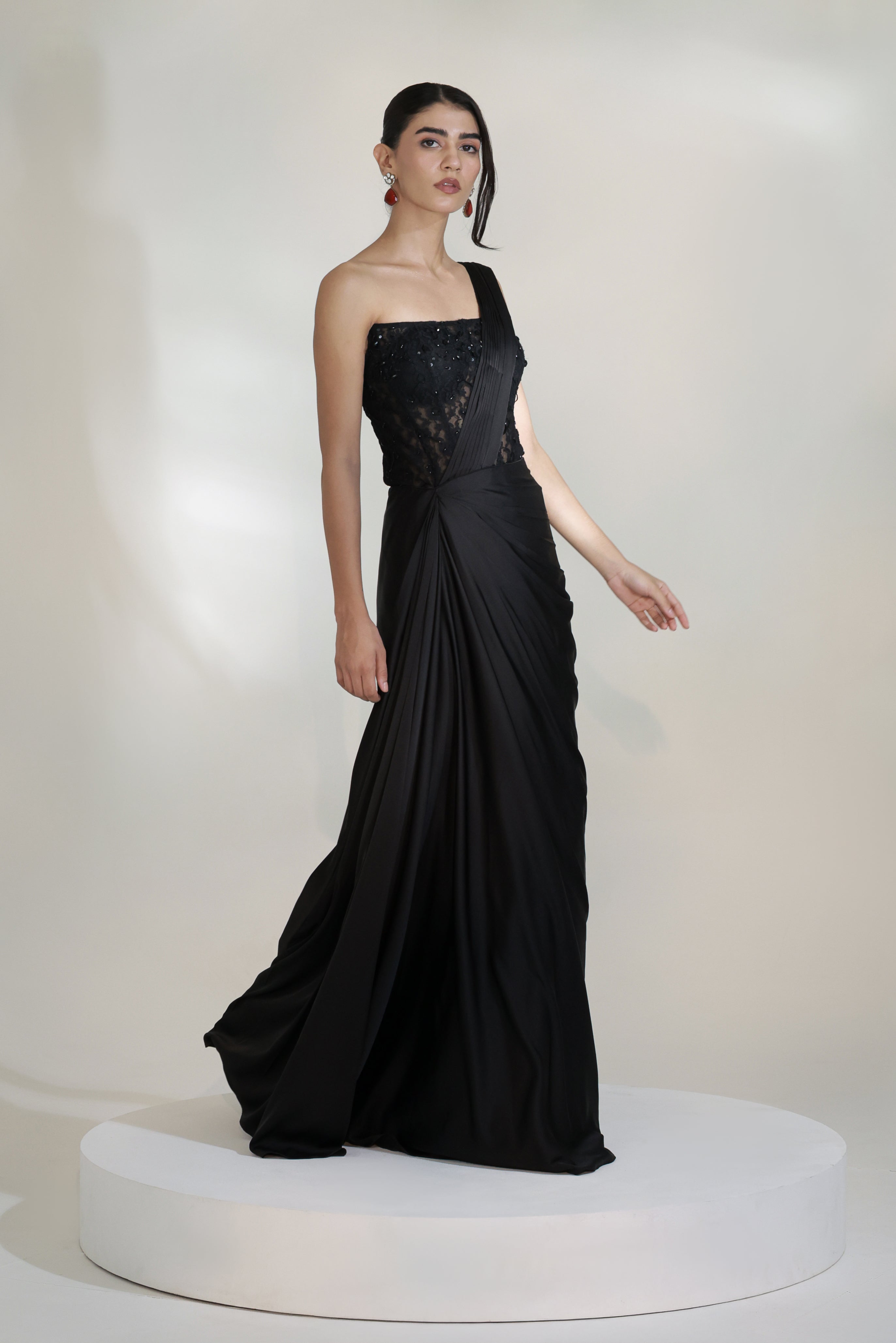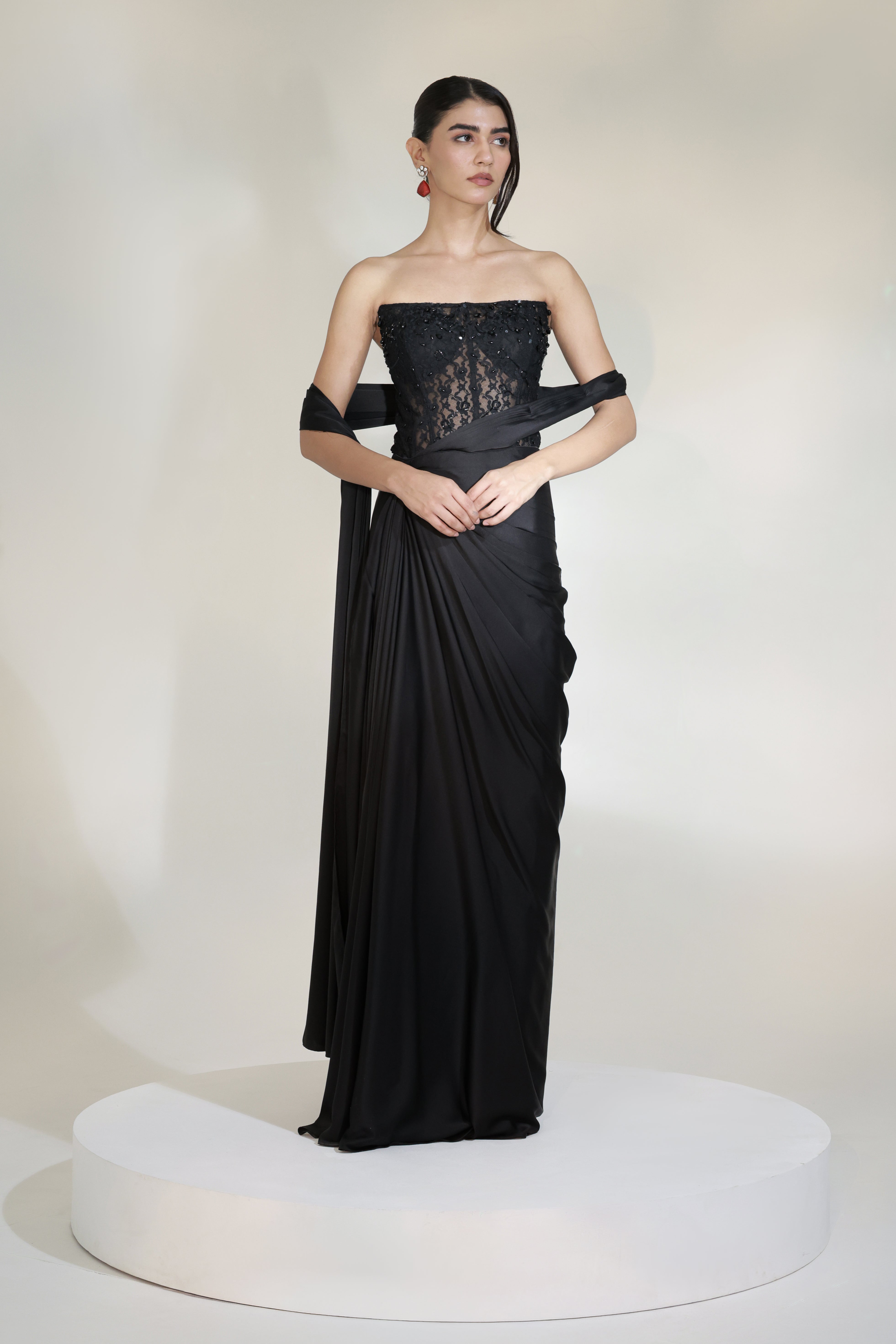 Command the spotlight in our BLACK Corset Saree — a sculpted silhouette that marries structure with fluidity. Designed in luxurious fabric, the corset contours the body with precision, while the pre-draped saree cascades effortlessly for a modern, yet timeless appeal. With refined gathers and a cinched waistline, this ensemble is your go-to for elevated celebrations and unforgettable entrances.