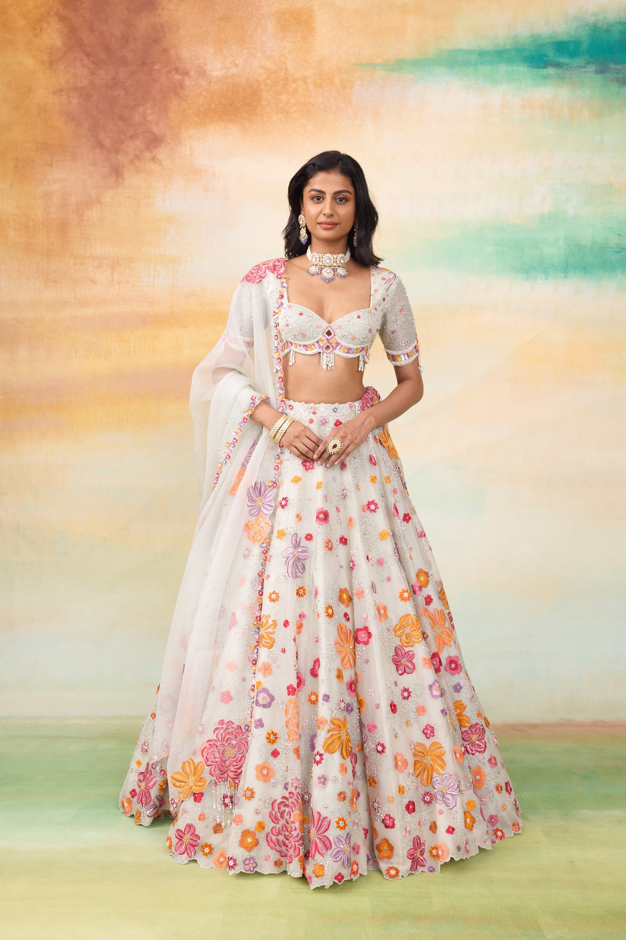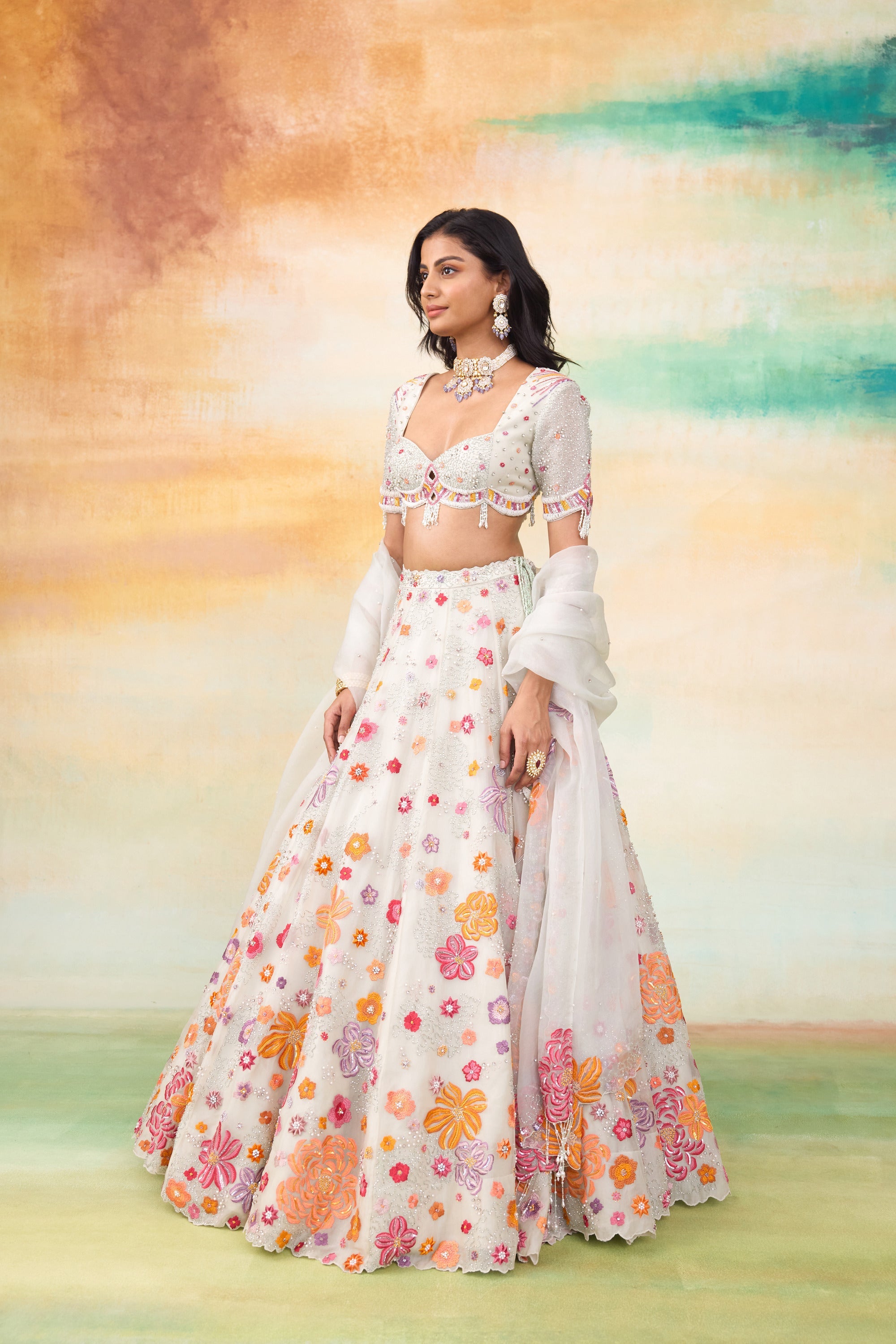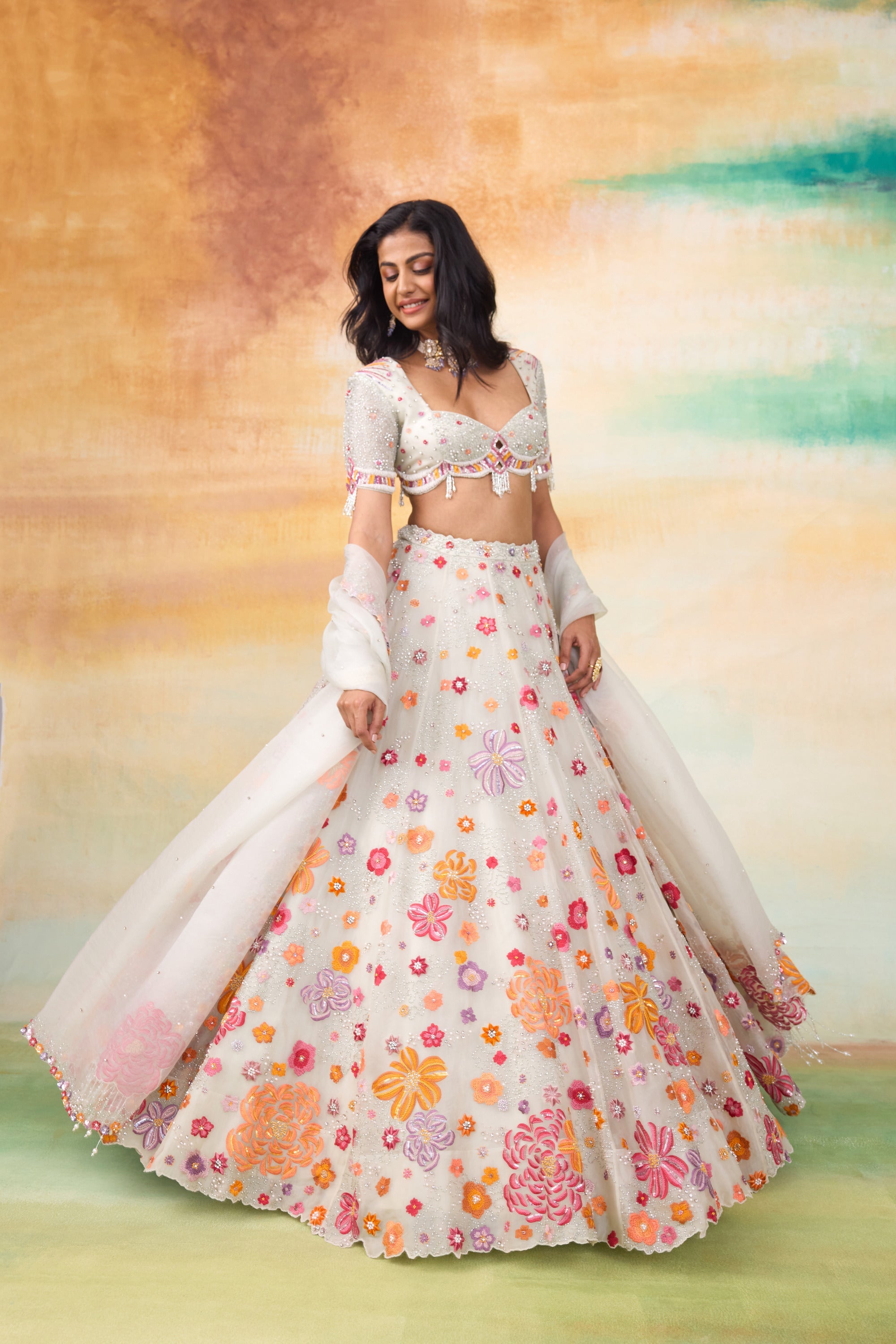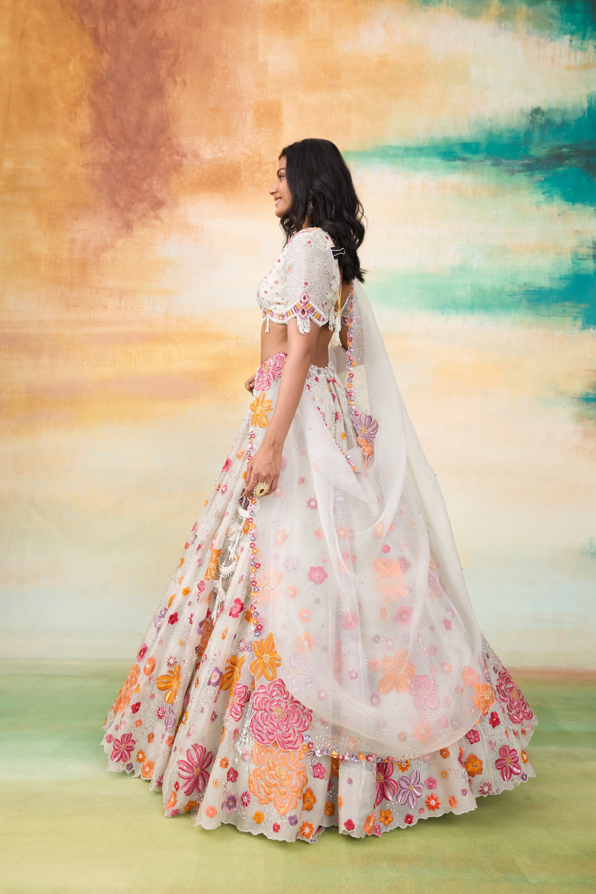 Our Fiona silk organza lehenga set is a stunning ensemble that exudes elegance and charm. The set features a beautifully hand embellished blouse paired With a delicate organza dupatta. Crafted in a serene mint hue, the lehenga is adorned with colorful motifs and intricate floral handwork. The embellishments include pearls, scalloped detailing, sequined flowers, and tone On tone tassels, all coming together to create an enchanting and sophisticated look.