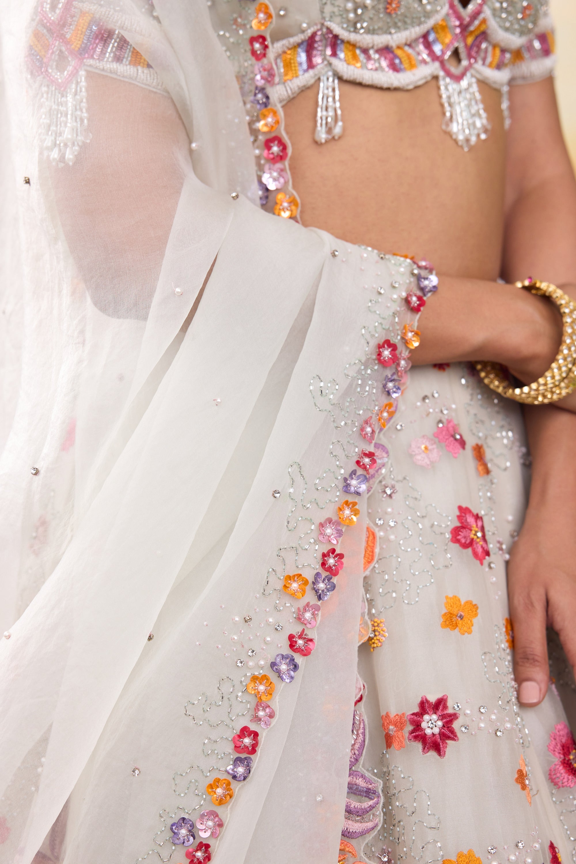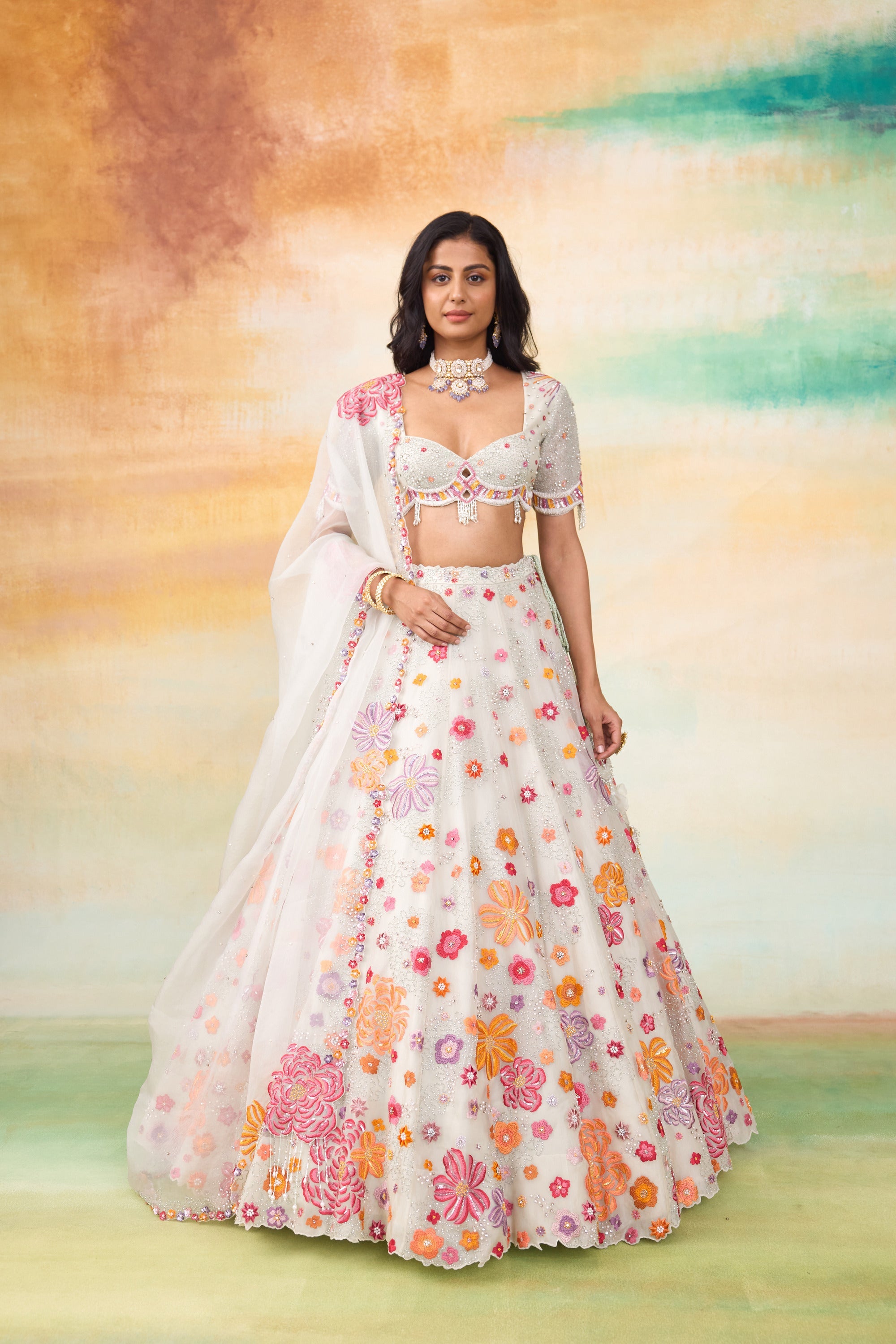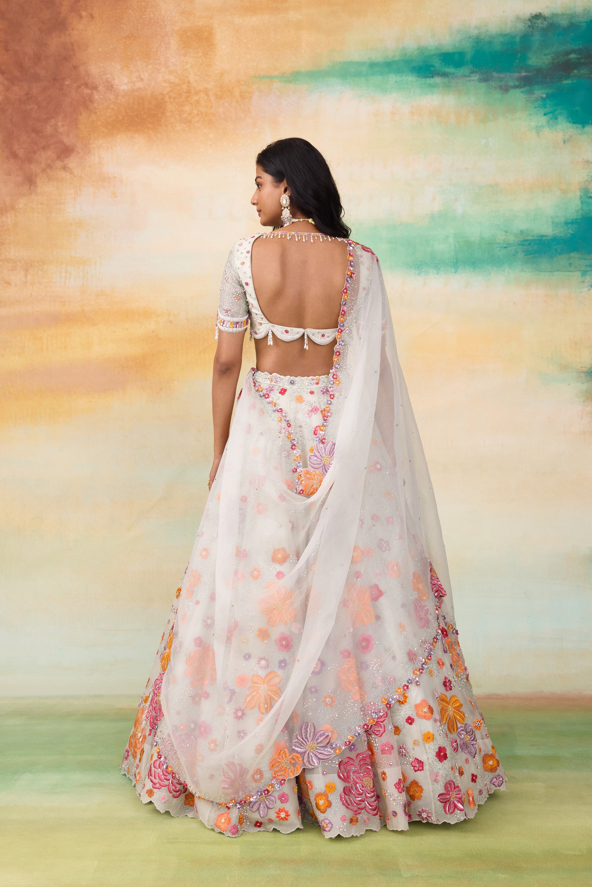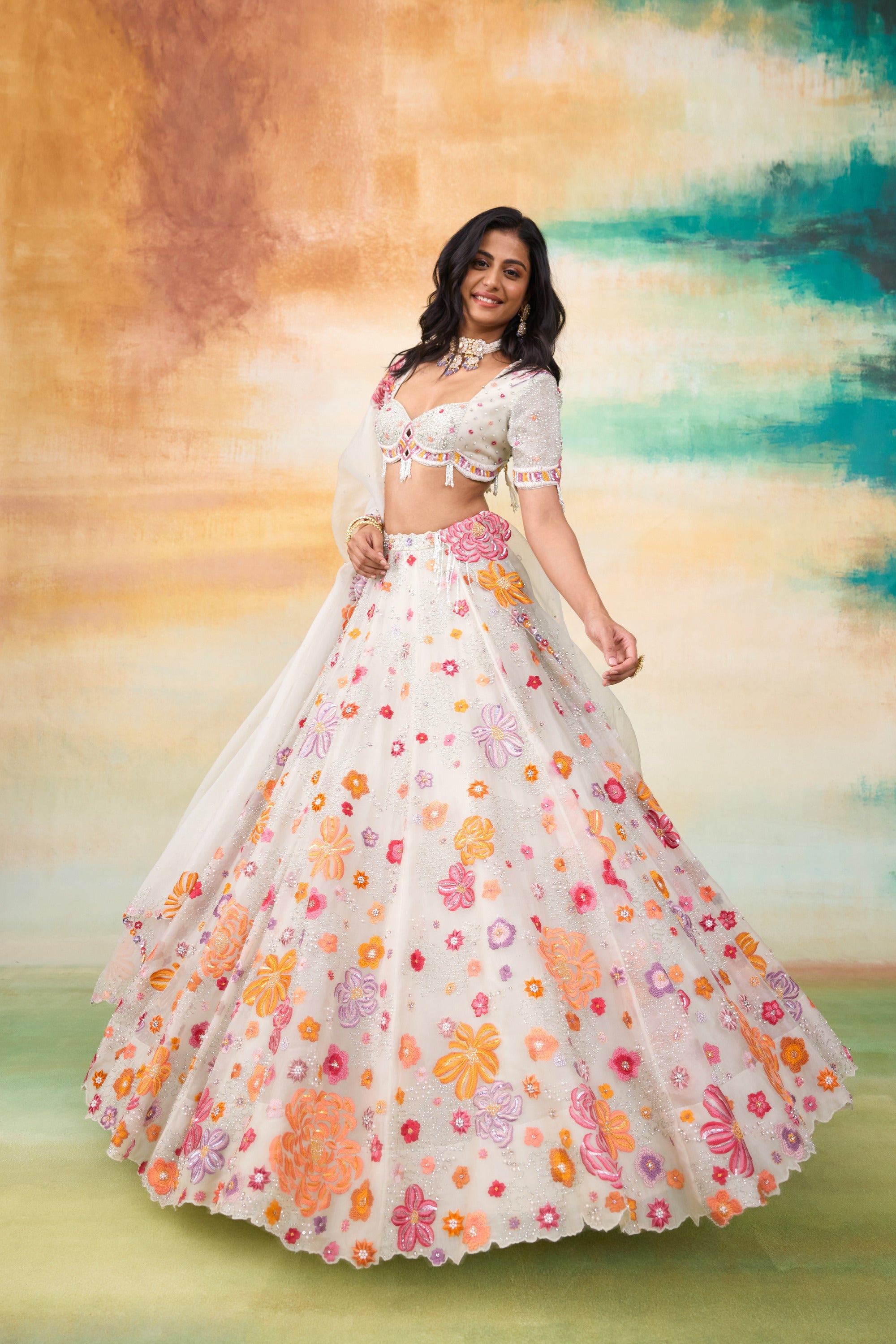 Our Fiona silk organza lehenga set is a stunning ensemble that exudes elegance and charm. The set features a beautifully hand embellished blouse paired With a delicate organza dupatta. Crafted in a serene mint hue, the lehenga is adorned with colorful motifs and intricate floral handwork. The embellishments include pearls, scalloped detailing, sequined flowers, and tone On tone tassels, all coming together to create an enchanting and sophisticated look.