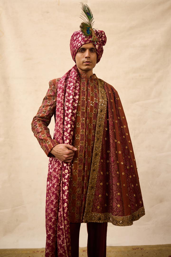 Brocade panelled one side Cape embroidered sherwani with velvet pants