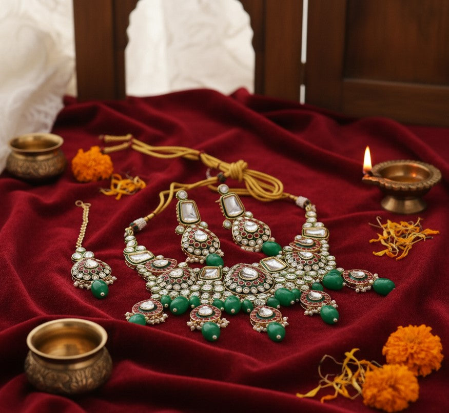The look is completed by cascading drops of large, polished Emerald-Green beads and delicate pearl clusters, which sway gracefully with every turn. The matching statement drop earrings perfectly mirror the necklace's opulent design, creating a complete and unforgettable look. A delicate Maang Tikka is also included, completing the traditional ensemble with grace.