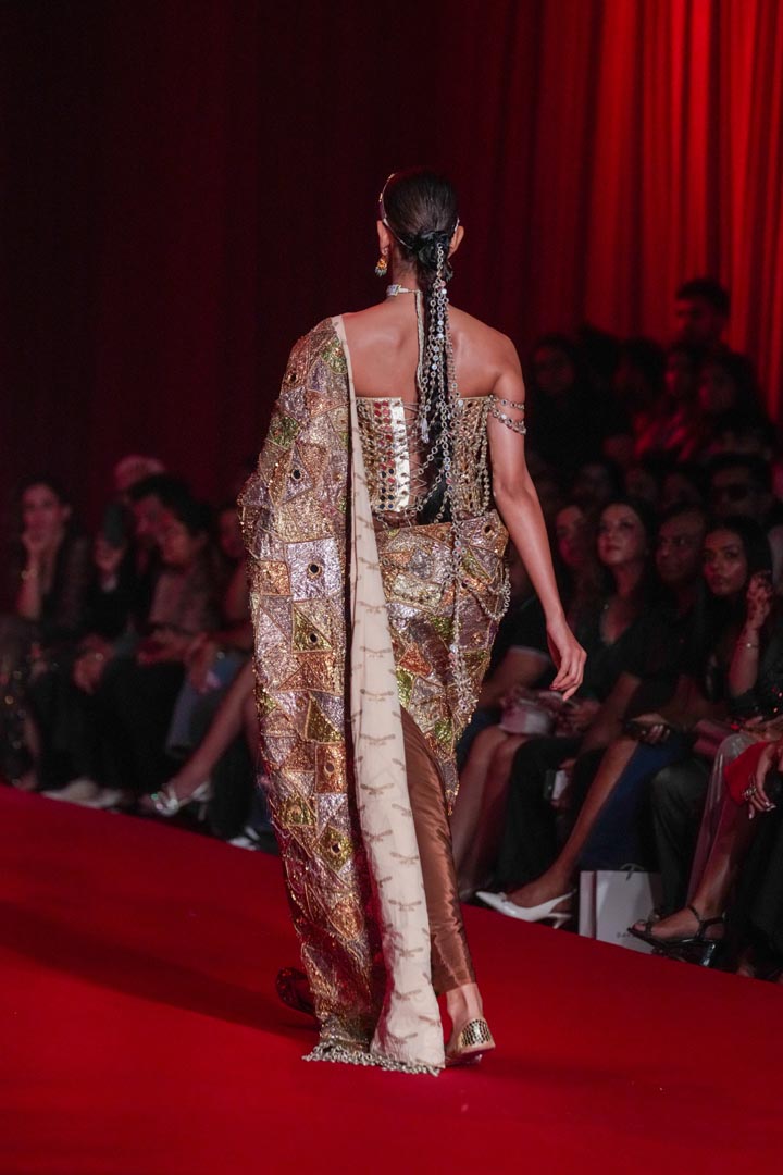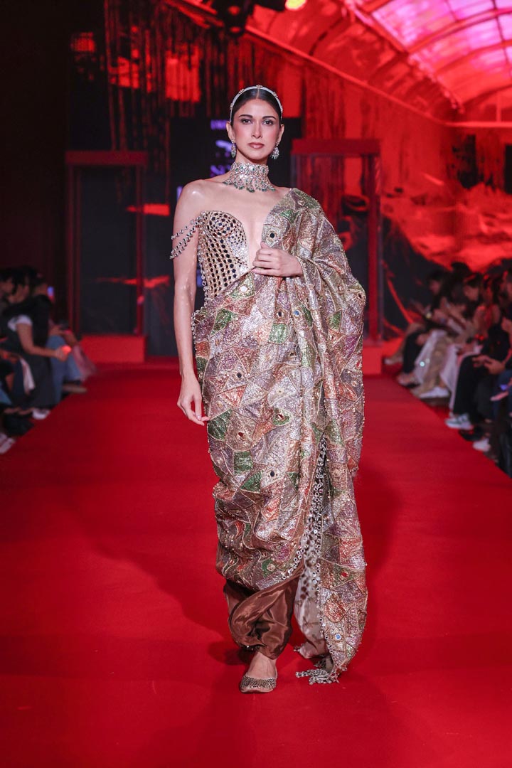 This patchwork saree features intricate embroidery in earthy tones of gold, green, and coral with mirror and stone embellishments throughout. The saree is paired with a heavily embellished mirror work blouse with off-shoulder detailing. Perfect for contemporary bridal wear and festive celebrations combining traditional craftsmanship with modern styling.