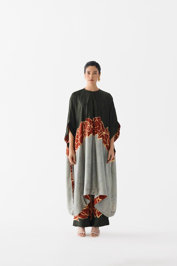 The Red Alba Kimono Kurta & pants crafted from our stunning vegan silk fabrication, trans-seasonal, is a statement piece. This two piece set, printed in our Red alba flower, has a centre back metallic zipper. With kimono sleeves, this set has a round neckline with bead details. It is paired with our matching pants in our Red Alba print with an elasticated back. Wear it with heels for an elegant look.