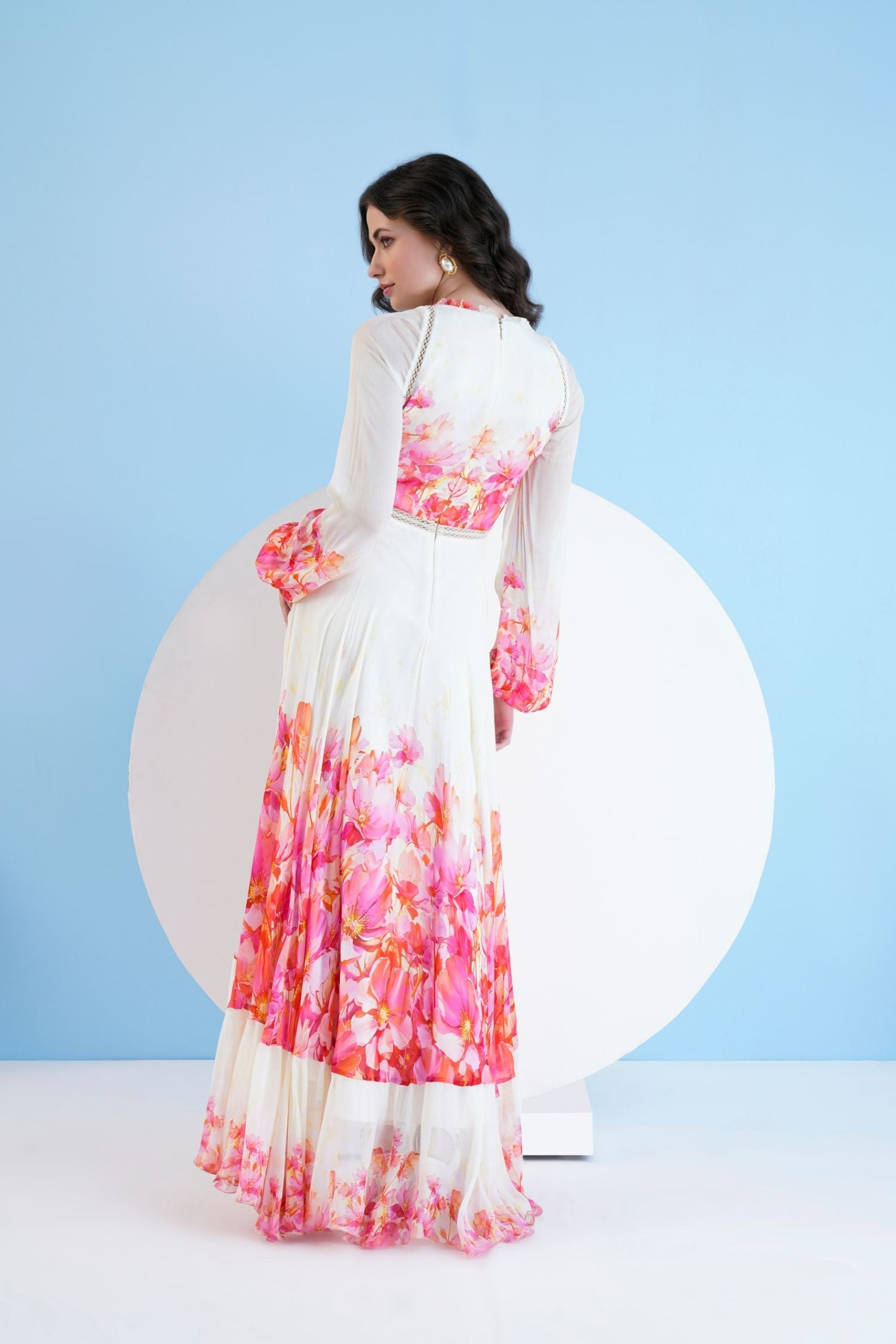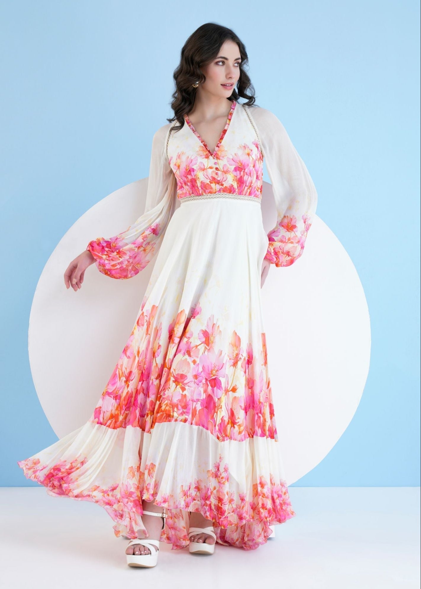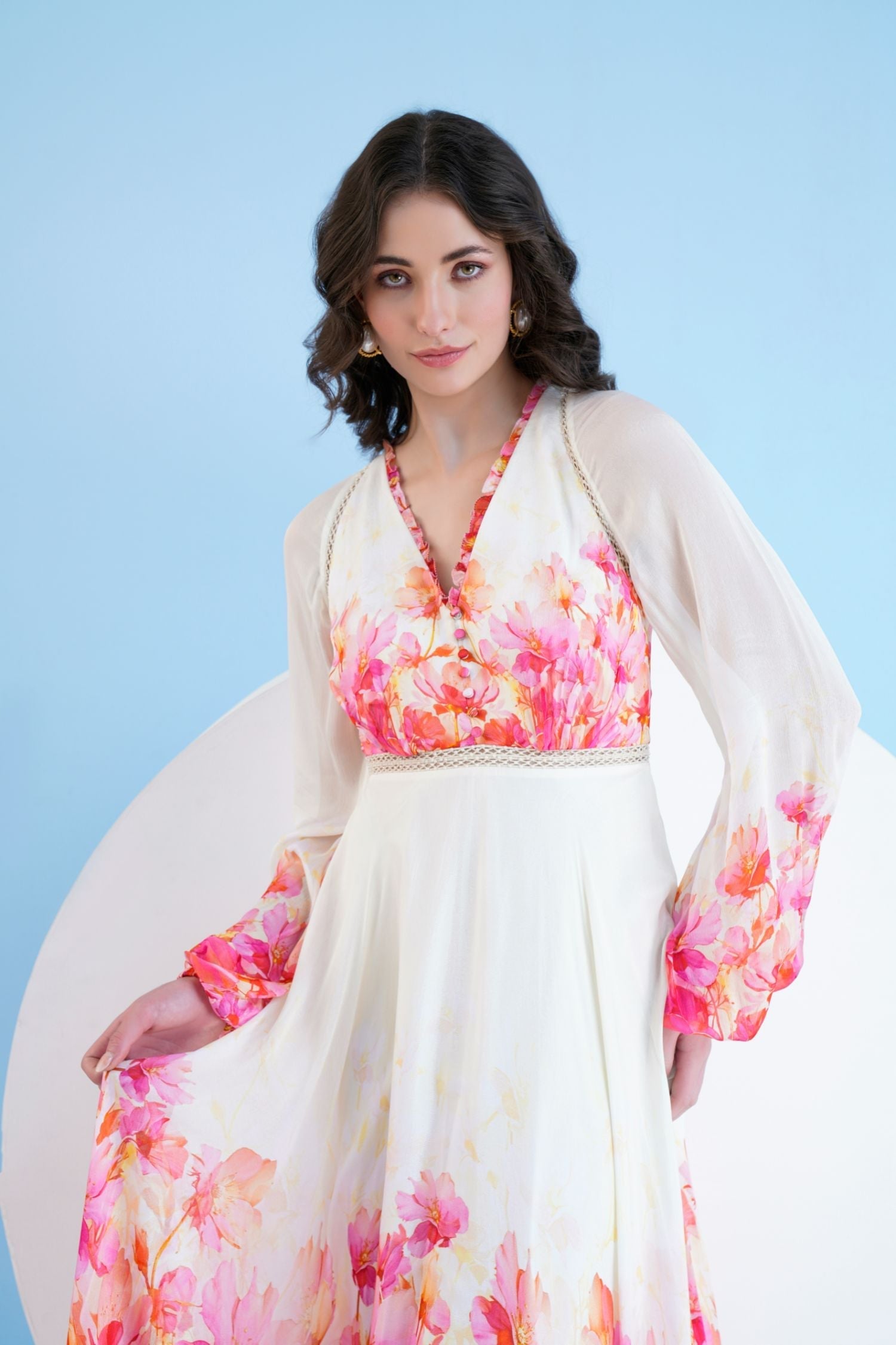 Featuring a red bauhinia printed long dress in chiffon with a plunging neckline and lace detail at the waist.