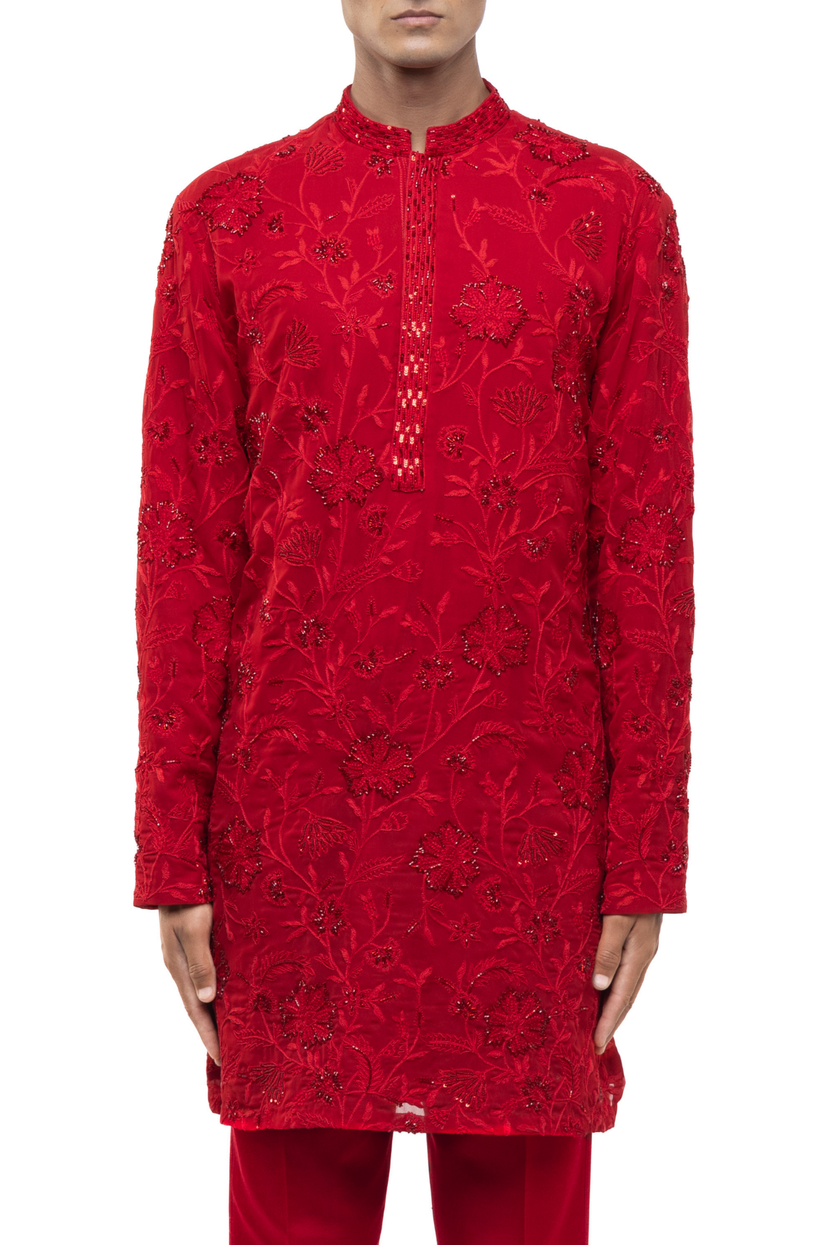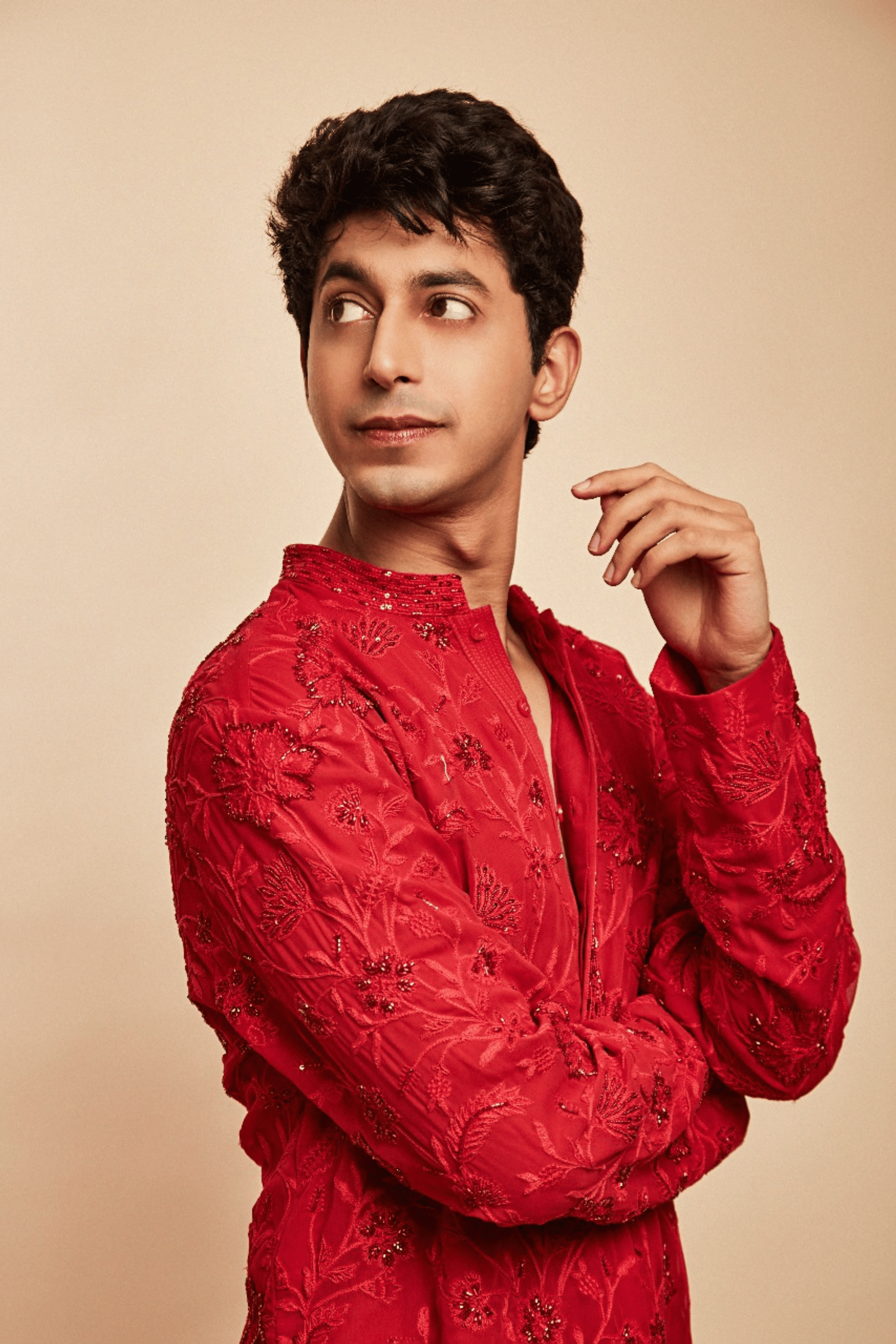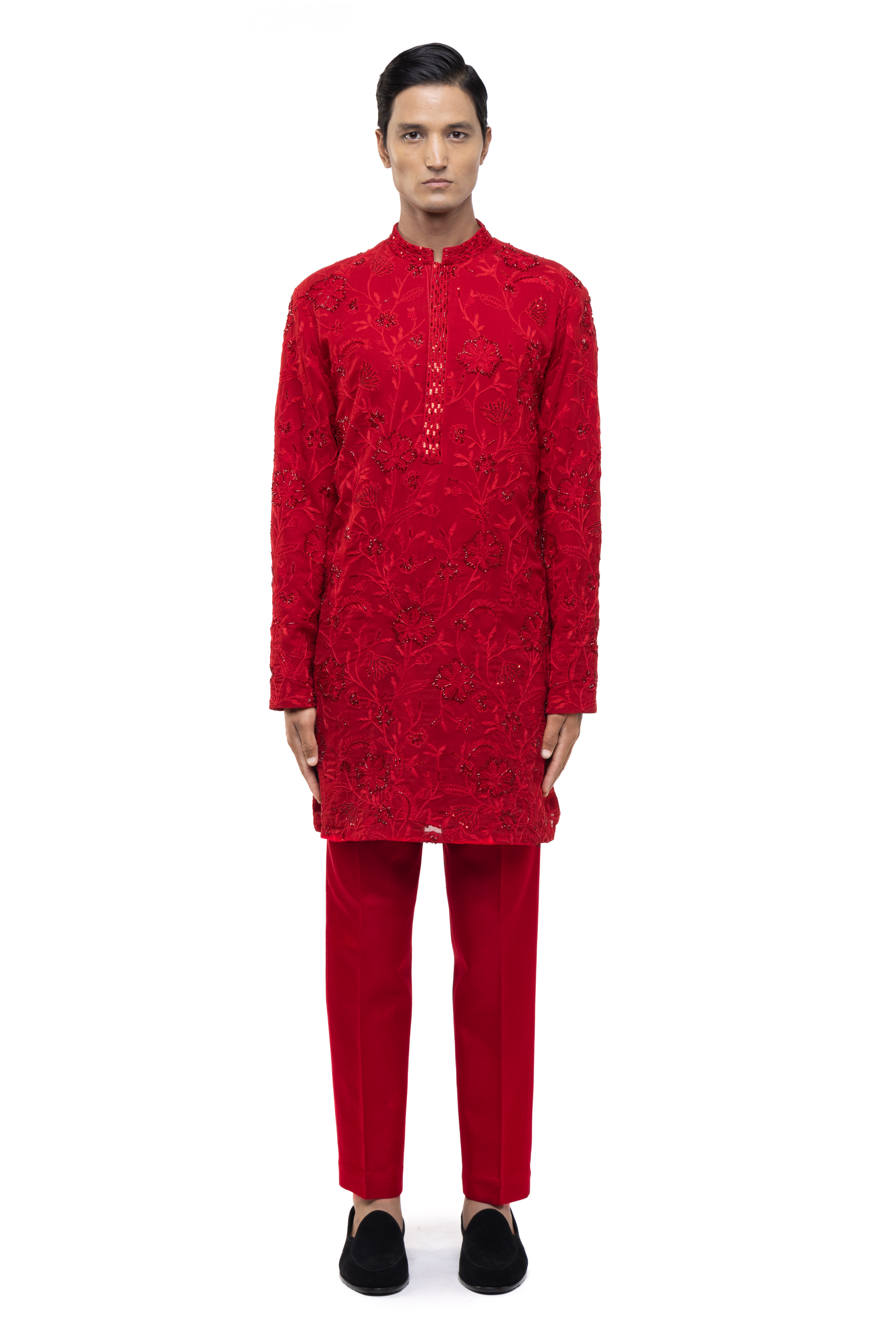 This red georgette kurta set features floral embroidery, making it a vibrant and graceful option for ethnic, festive, and sangeet celebrations.