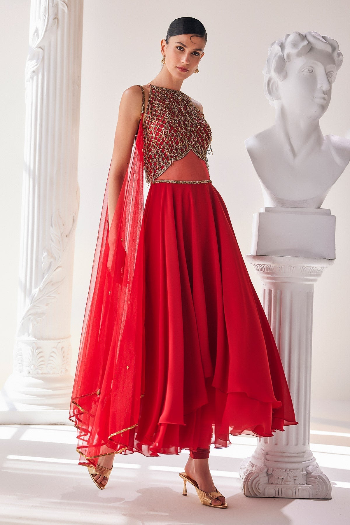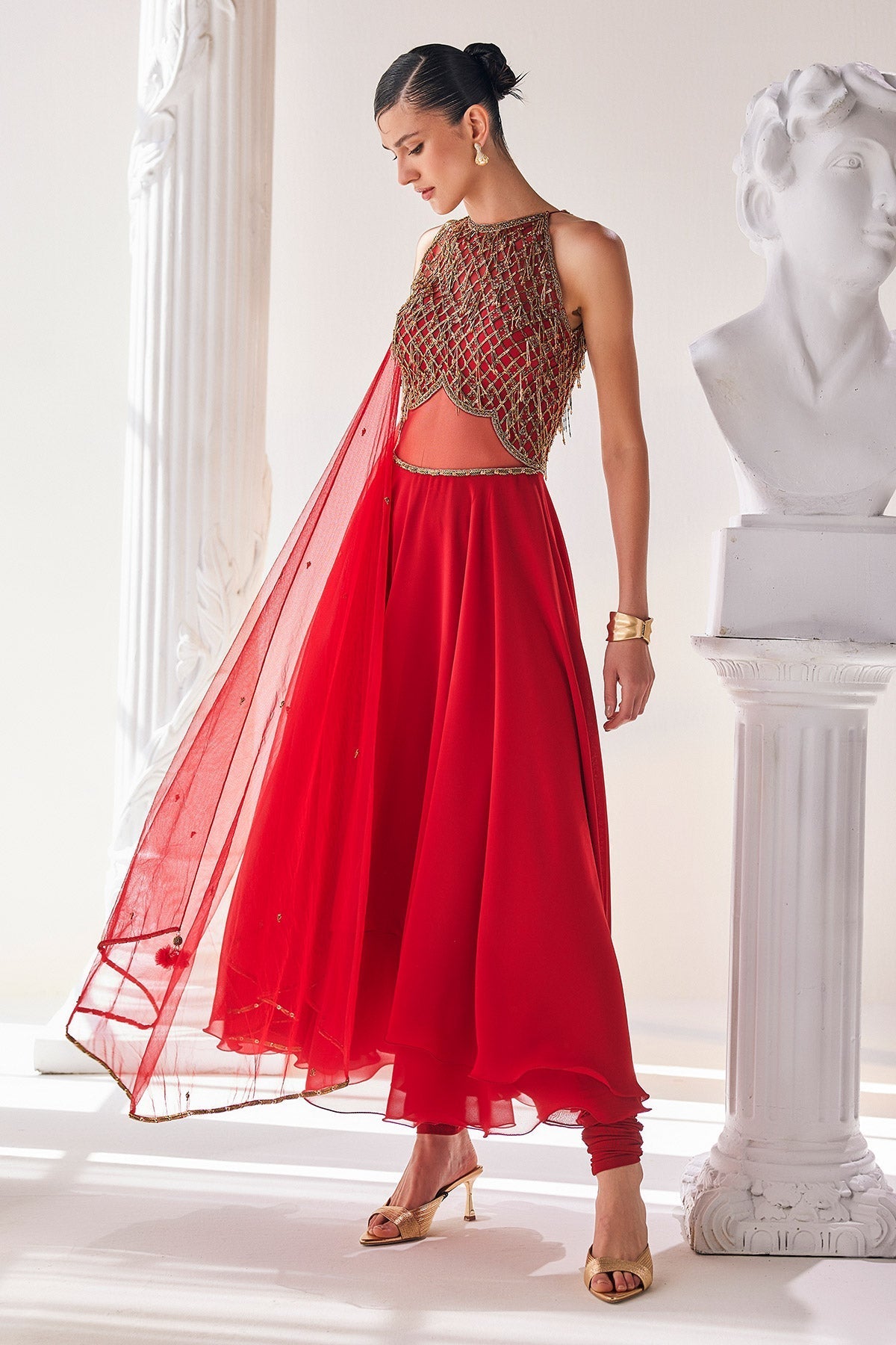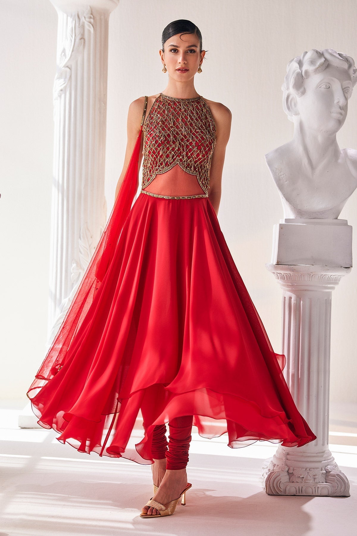 Our captivating red georgette high-low anarkali set. It's intricately embroidered bodice exudes elegance, while the flowing silhouette adds grace. Accompanied by a matching churidar and a delicate net dupatta, this ensemble is perfect for any special occasion.
