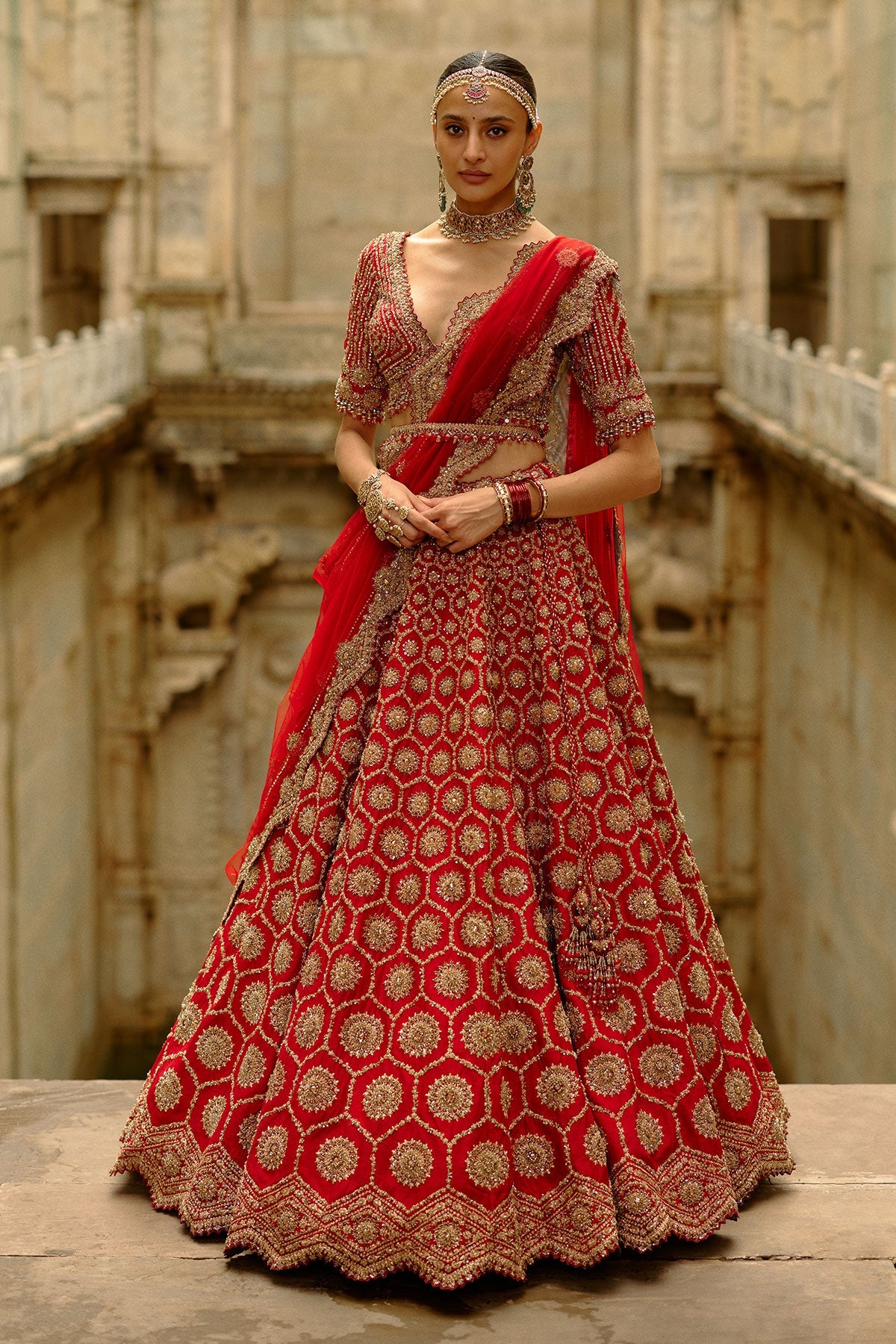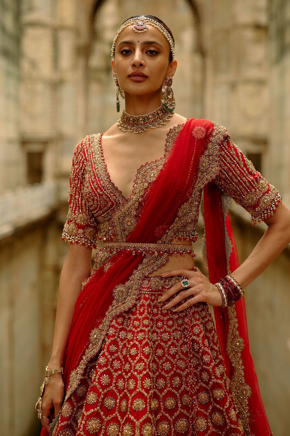 Red raw silk lehenga choli dupatta set intricately embroided with crystals, dabka work, zari and zardozi embroidery. It can be paired with an optional veil.