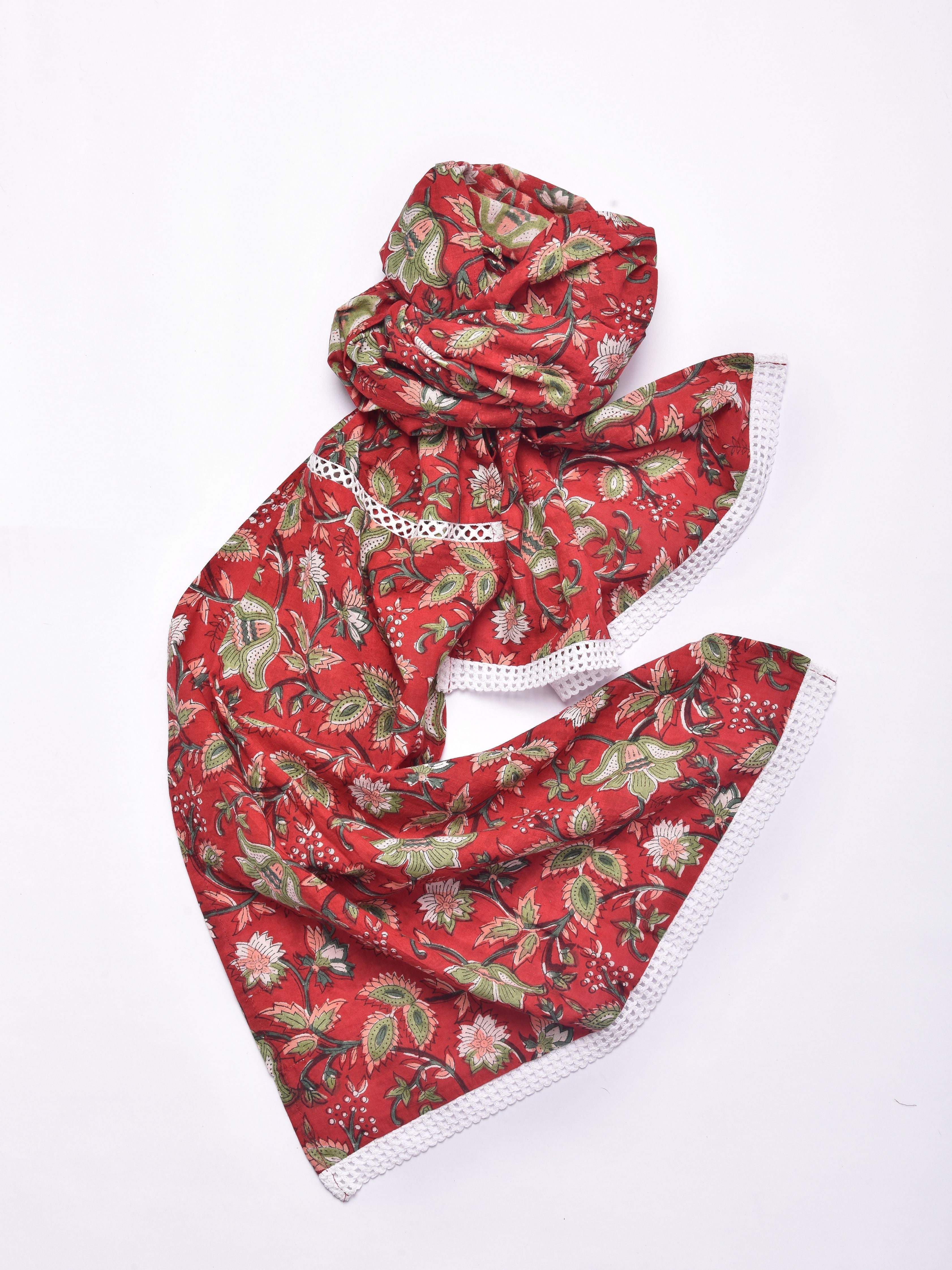 - Cotton block printed slote with lace details.