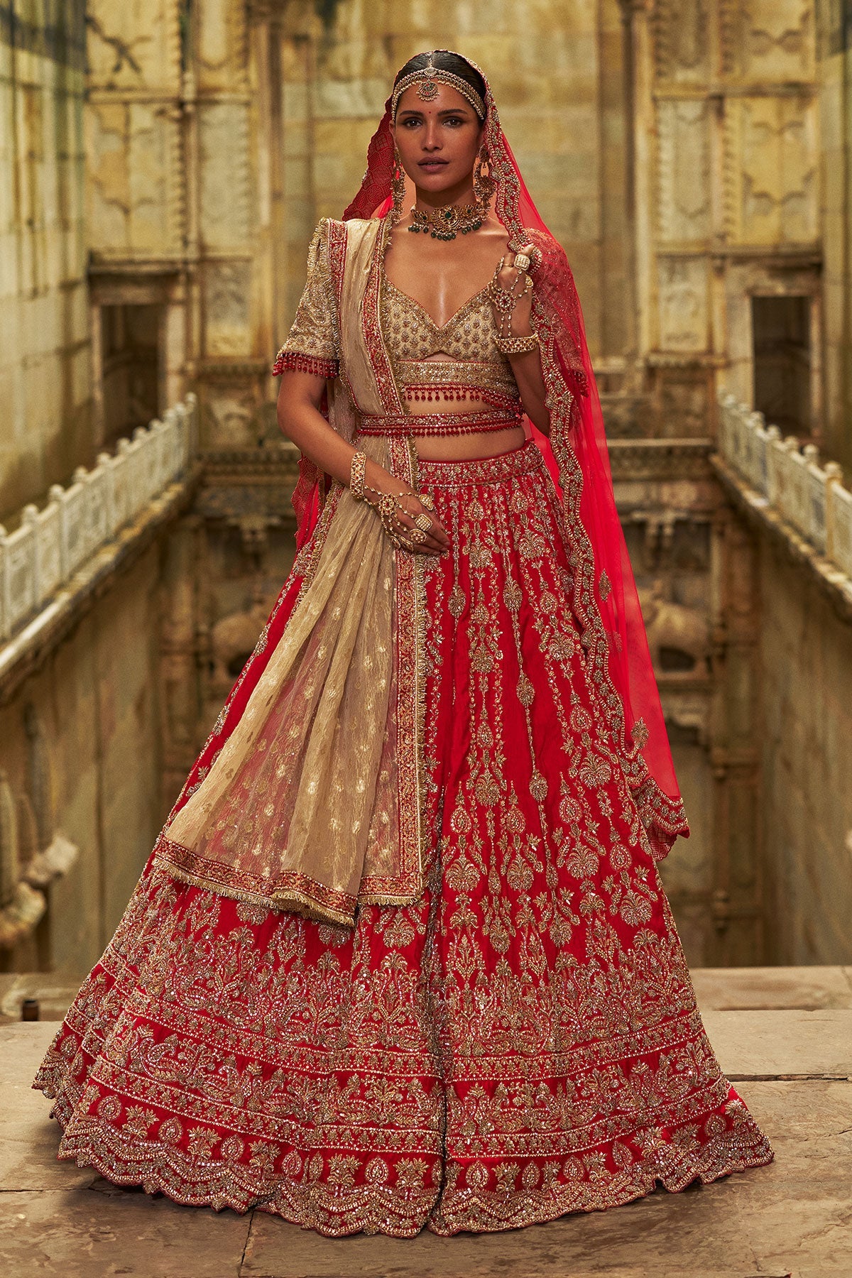 Red raw silk lehenga paired with a gold choli, featuring intricate hand embroidery with sequins, zari, dabka, zardozi, pearls, and cut dana. Can be styled with an optional second dupatta for a grander look.