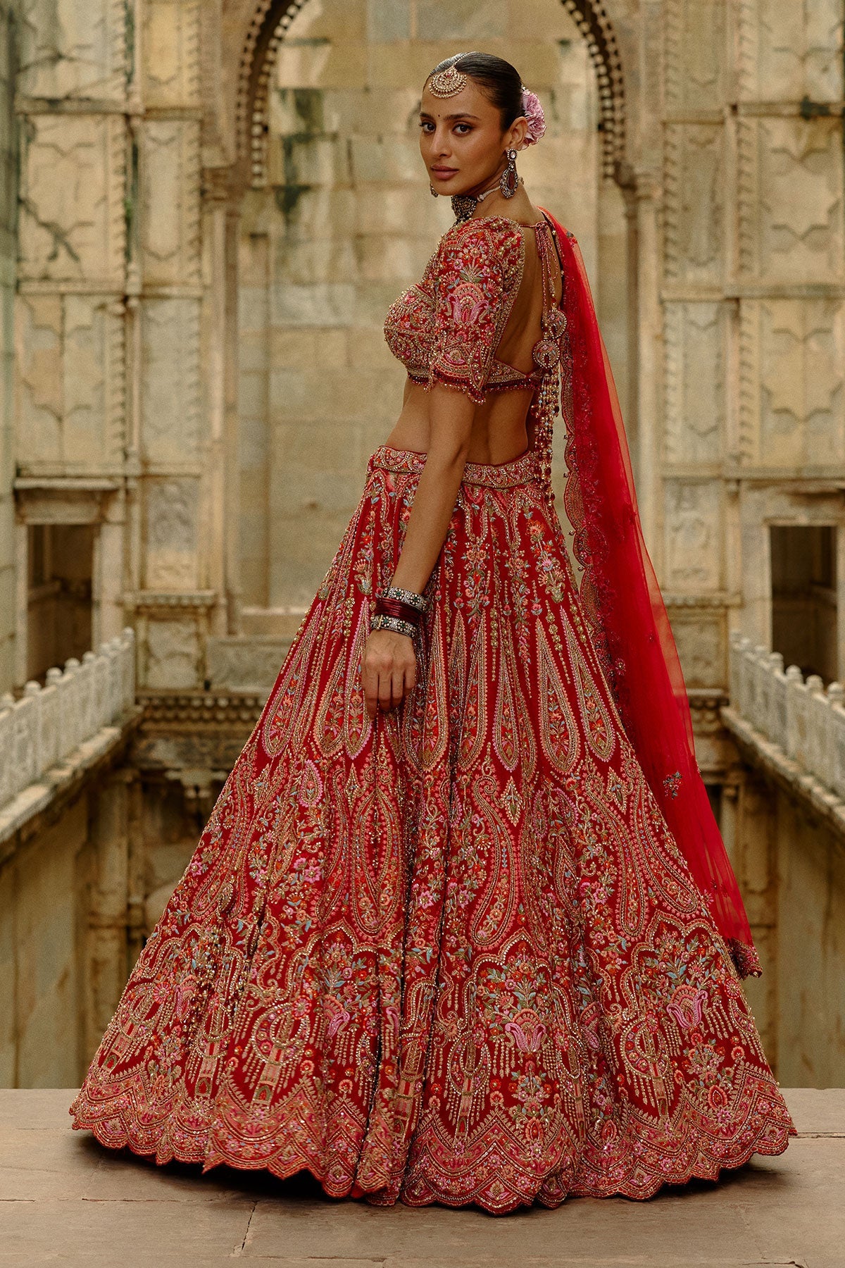 Red raw silk lehenga set intricately embroidered with multi-coloured resham threadwork, adorned with pearls, zari, crystals, and zardozi detailing. A perfect blend of traditional craftsmanship and elegant embellishments.
