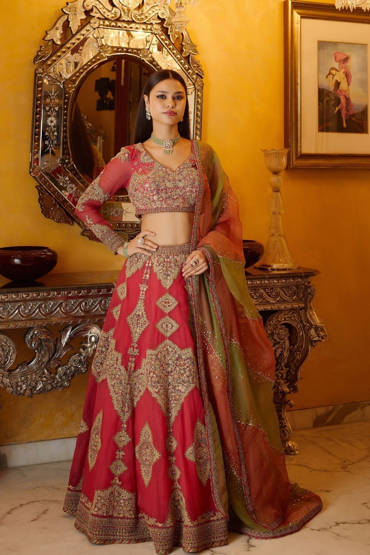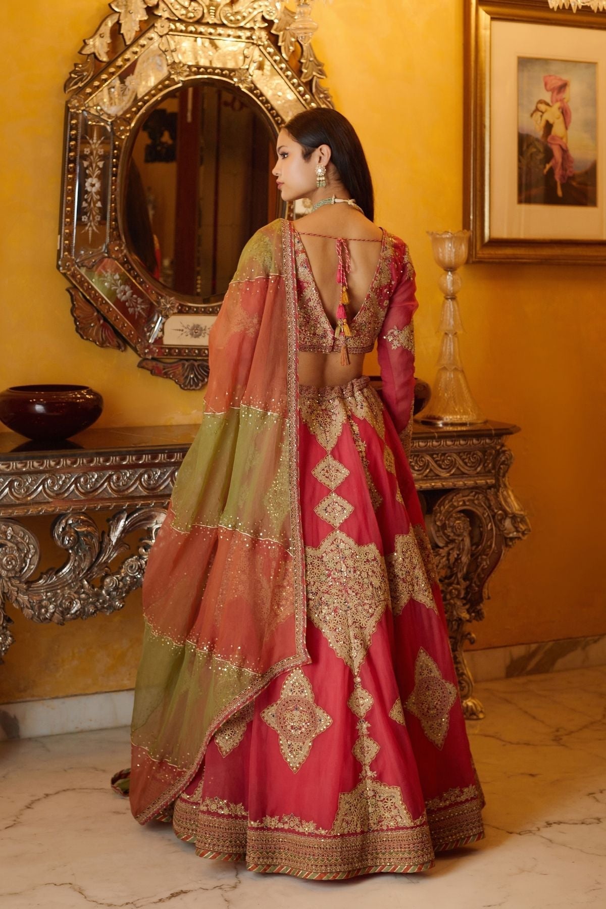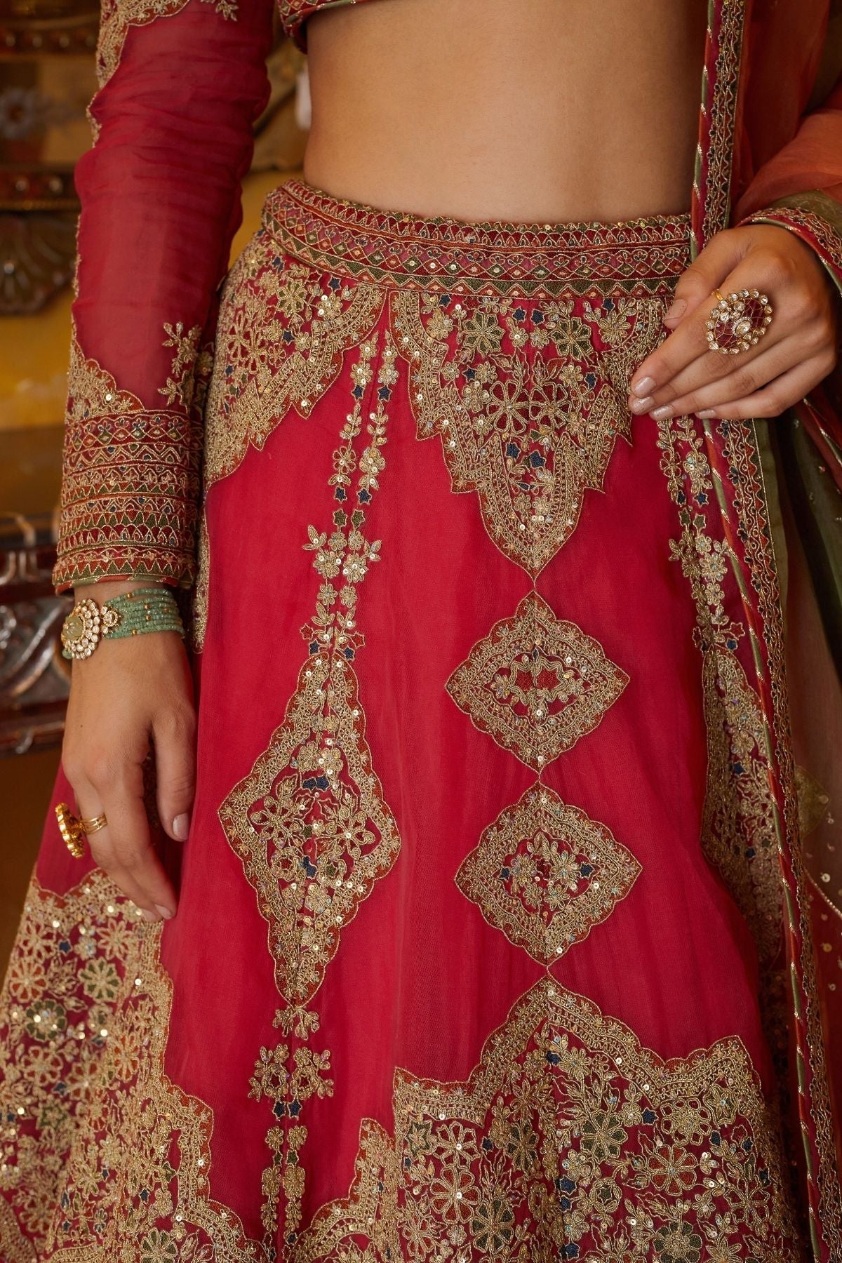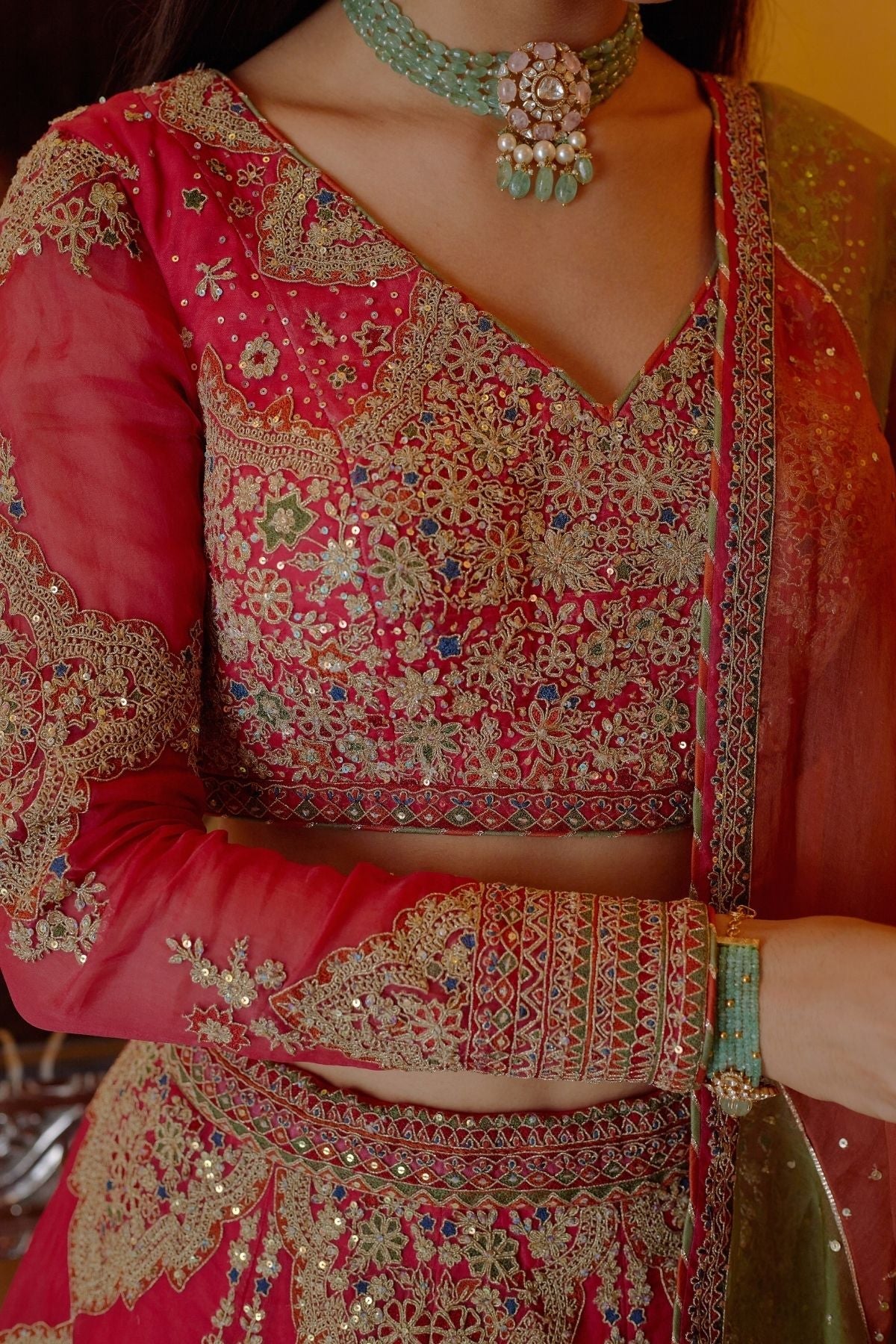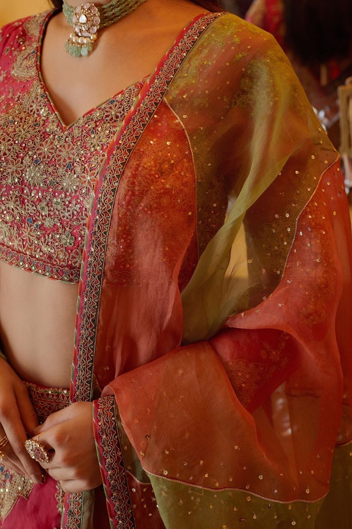 Zari dori or cord work with highlighting of sequins work and dupatta with diagnal surface ornamentation work and sequins details.