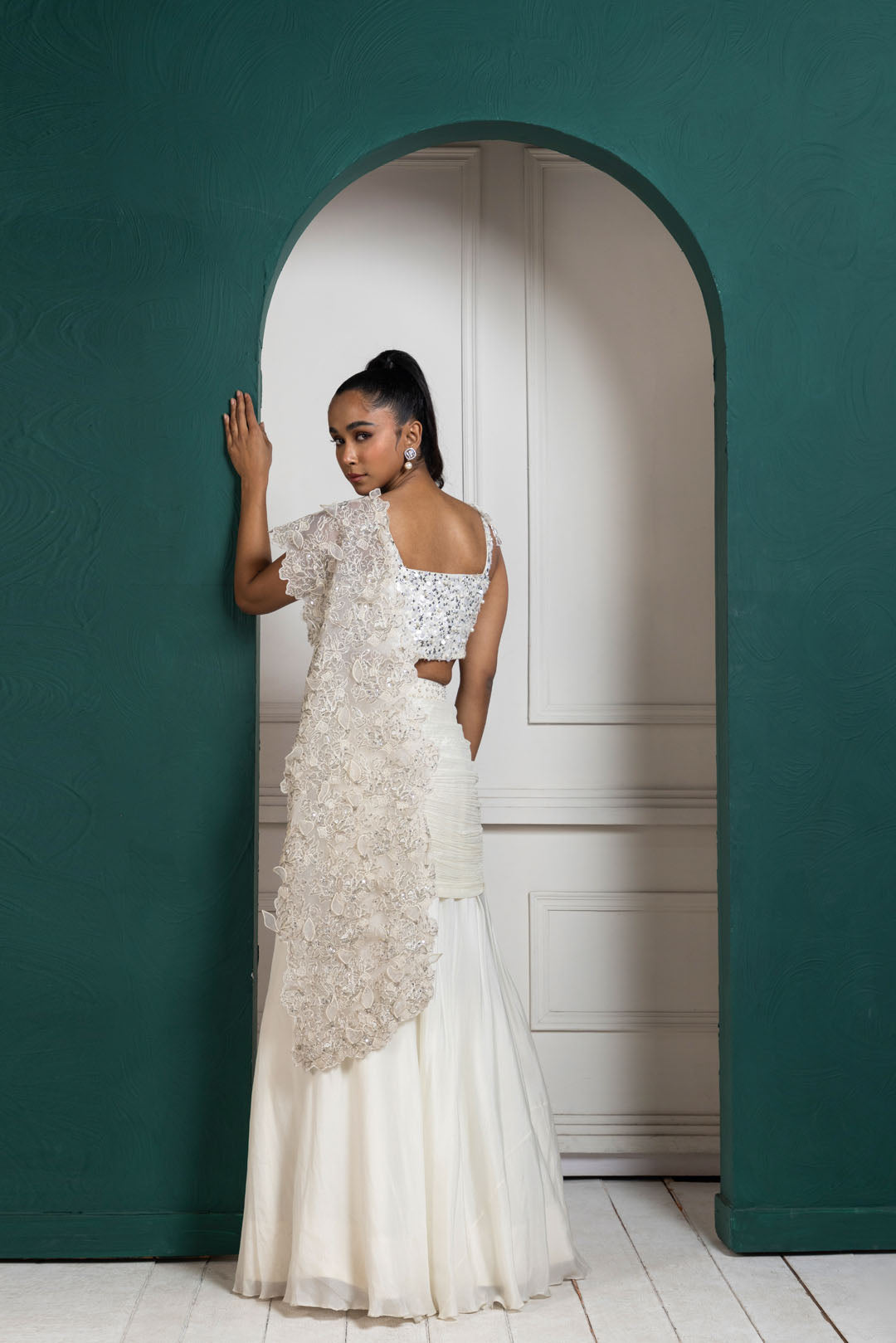 This ethereal white drape saree blends elegance with modern design. The gown features intricate floral lace appliqué encrusted with shimmering crystals on the bodice, creating a luxurious, asymmetrical design. One-shoulder detailing with a sheer lace sleeve adds a contemporary flair. The waistline is adorned with a soft drape that cinches gracefully, enhancing the silhouette and flowing into a voluminous, floor-length skirt with cascading pleats. The combination of textures and embellishments makes this a statement piece ideal for engagement ceremonies, receptions, or evening galas.