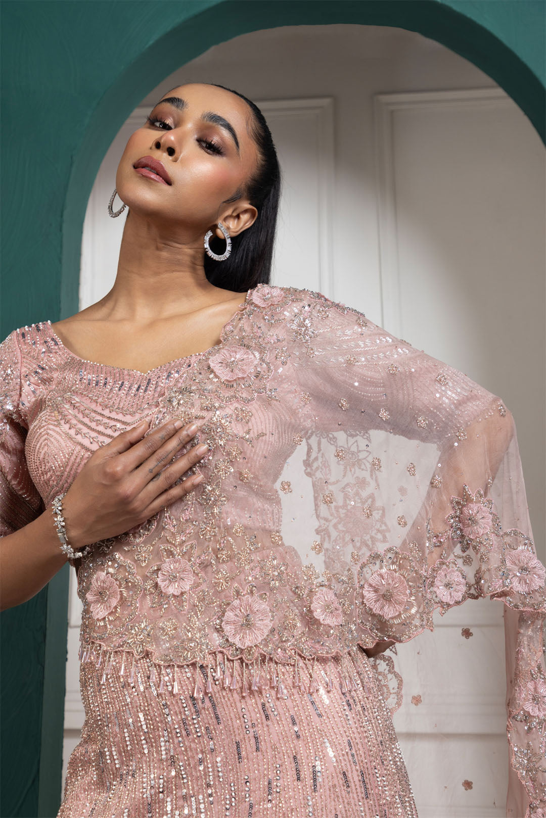 A dazzling rosé-toned lehenga set, intricately adorned with shimmering embellishments that exude sophistication and charm. The lehenga is paired with a gracefully designed blouse featuring ornate embroidery and delicate floral motifs. Completing the set is a complementary dupatta that adds elegance to the ensemble, making it a perfect choice for weddings, receptions, or grand festivities.