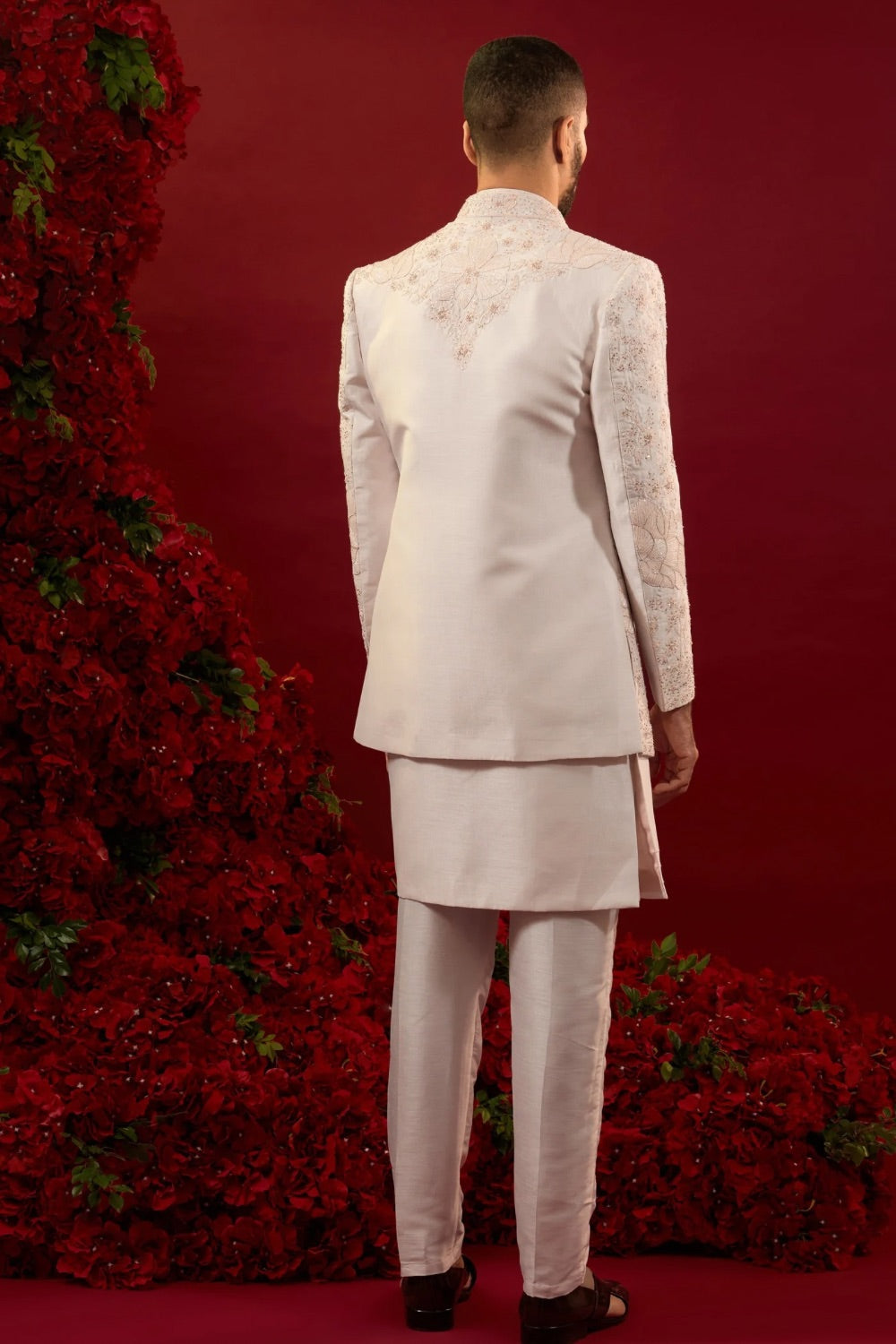 Experience luxury with our rose white silk open koti set, featuring kurta and a koti, adorned with detailed machine work. Paired with matching pajama.