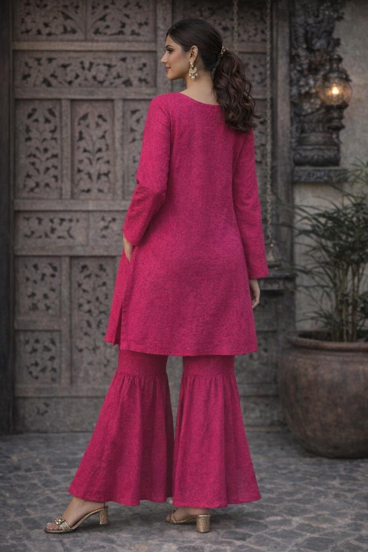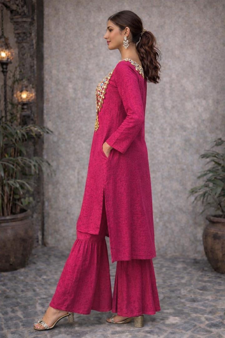 The Roseline Set with Potli bag features a fluid Pink kaftan adorned with intricate mirror patchwork and antique coin embellishments that move gently with every stepreflecting light like fragments of moonlit glass.