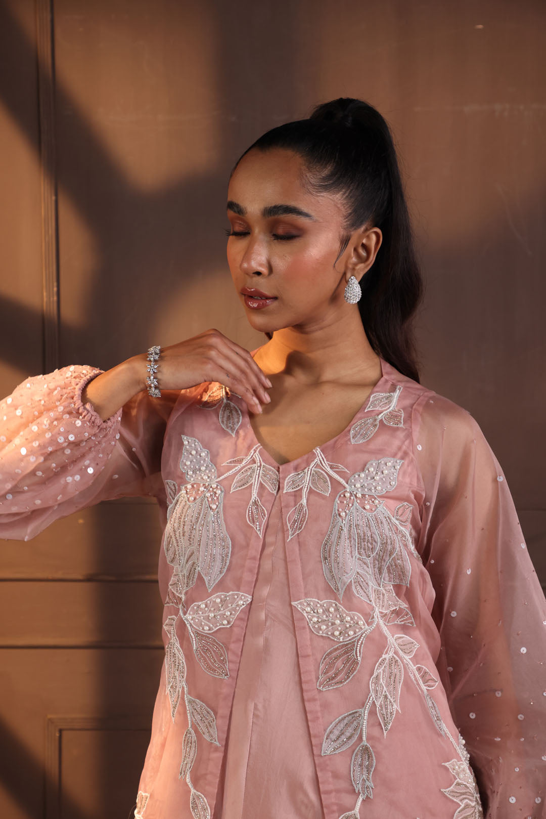 This elegent dress exudes sophestication and and charm with its blush pink organza base, adorned with intricate floral embroidery and delicate embellishments. The sheer fabric adds an ethereal touch, while the high-low hemline creates a dramatic yet graceful silhouette. The long, translucent sleeves, detailed with subtle polka dot accents, complement the overall design, adding a modern edge to the classic aesthetic. Perfect for evening occasions or formal gatherings, this dress is a statement piece that seamlessly blends traditional craftsmanship with contemporary style.