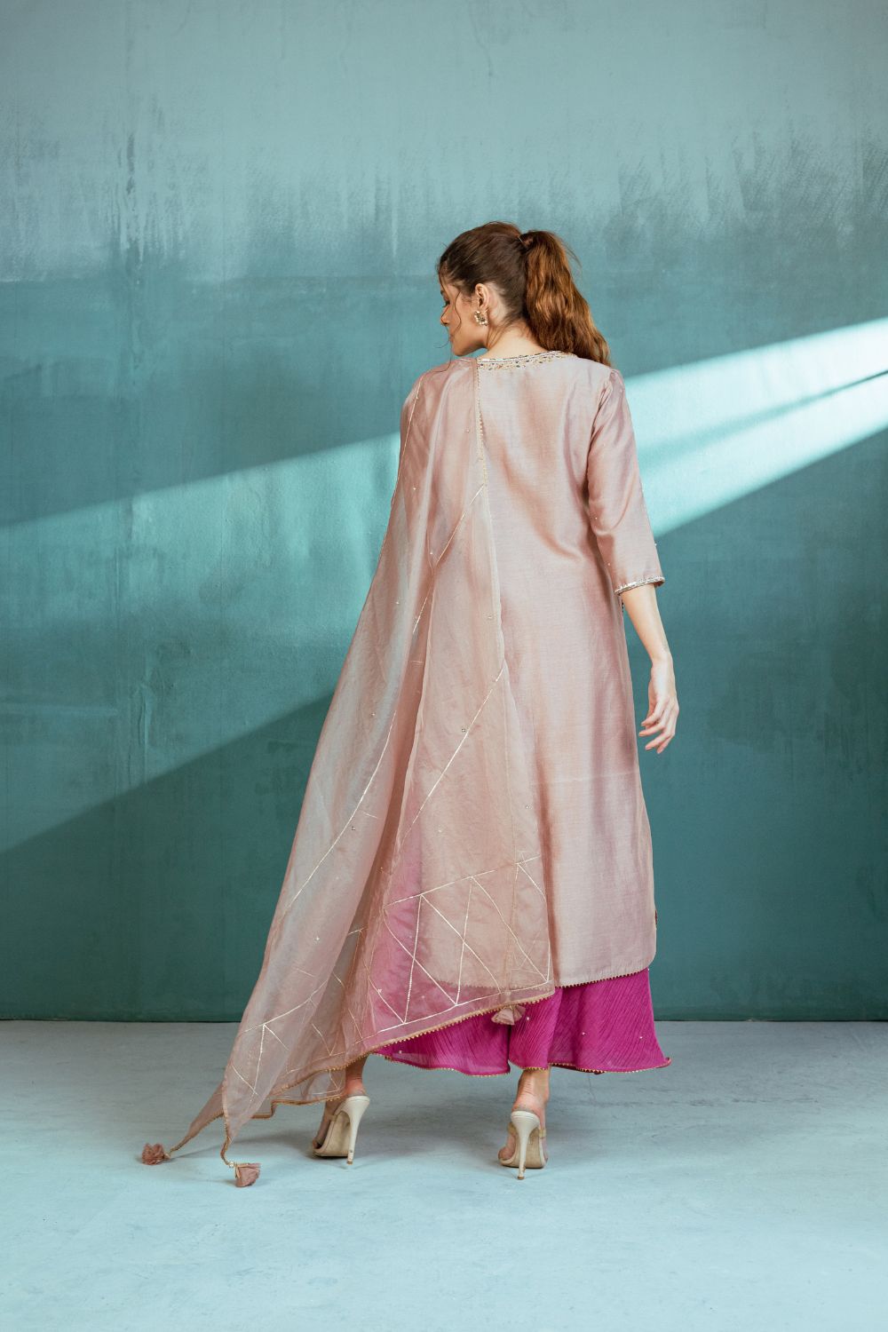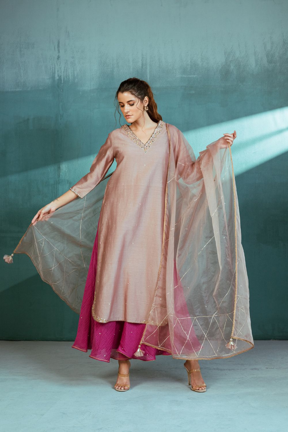 Rosy Brown Chanderi Gota Embroidered Round Hem Kurta With With Purple Light Chanderi Embroidered Sharara And Rosy Brown Gota Embroidered Organza Dupatta.