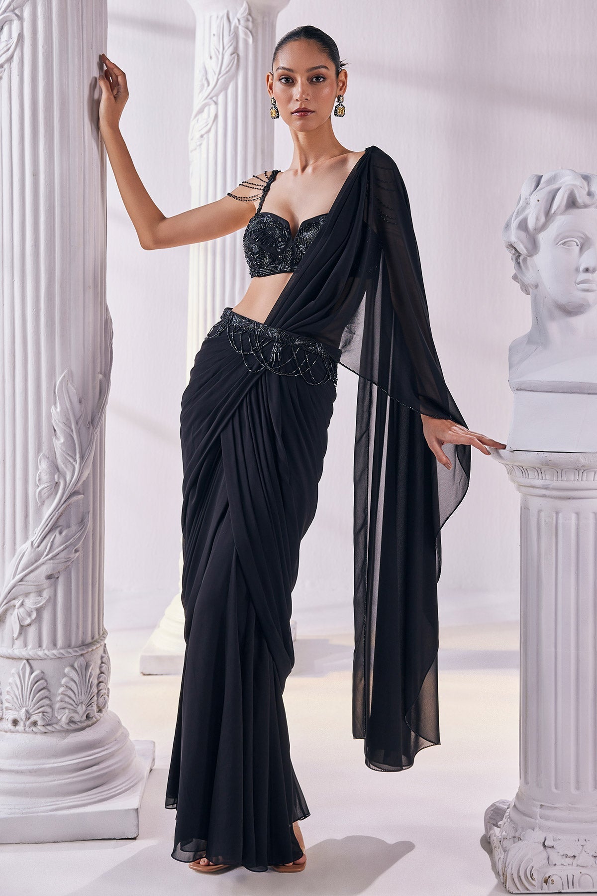 Elevate your style with a black draped saree in royal georgette fabric. It features a bustier covered in beads and highlighted with hem detailing on the hem.