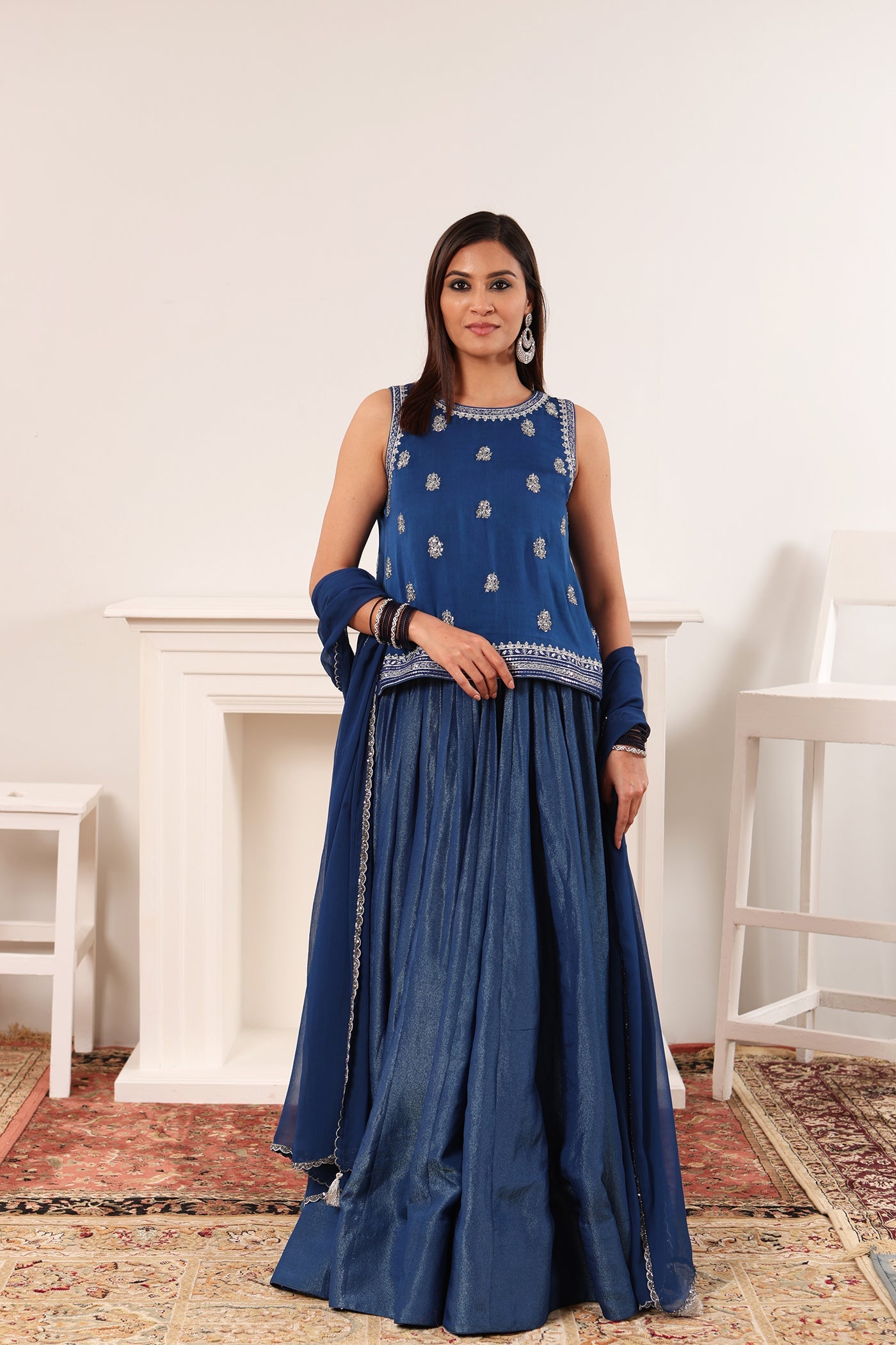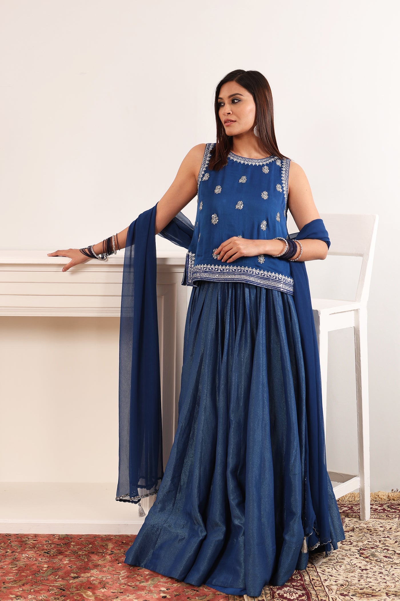Royal-Blue Hand-Embroidered Silk-Tissue Lehenga-Set With Satin Kurti & Chiffon Dupatta