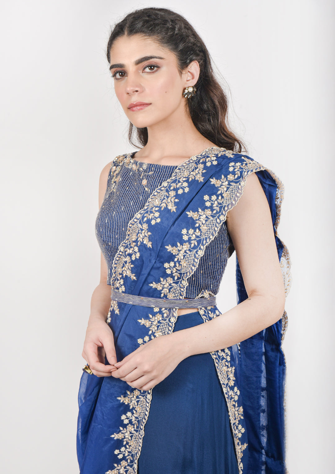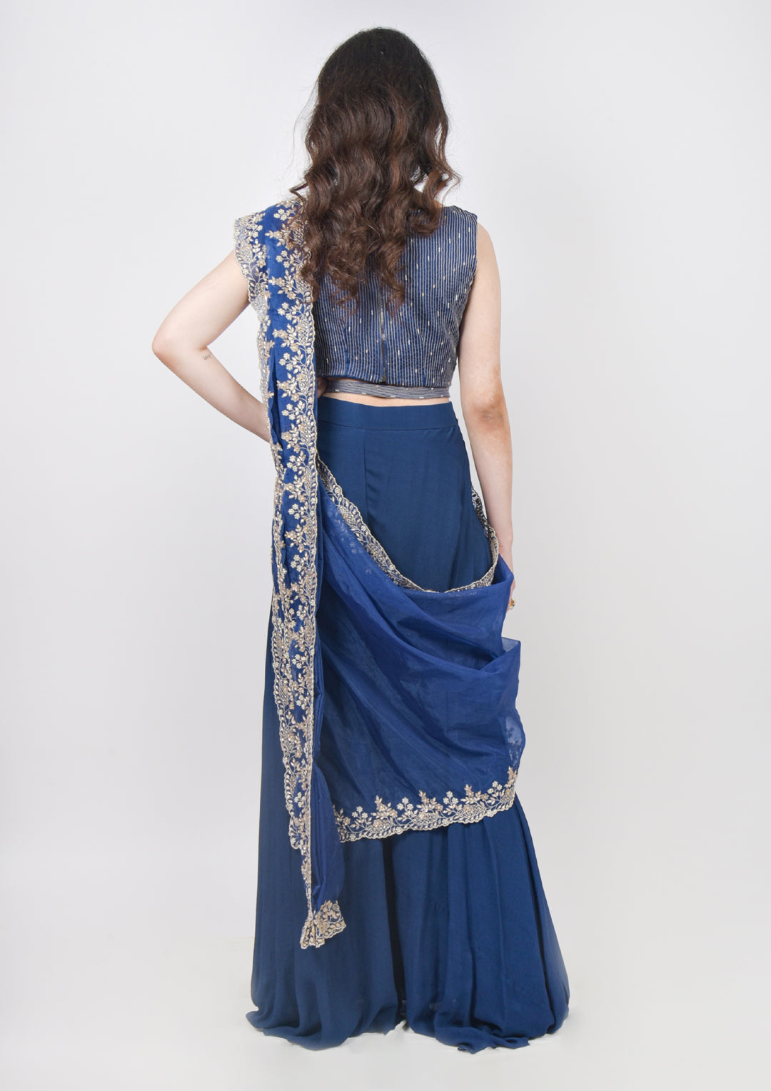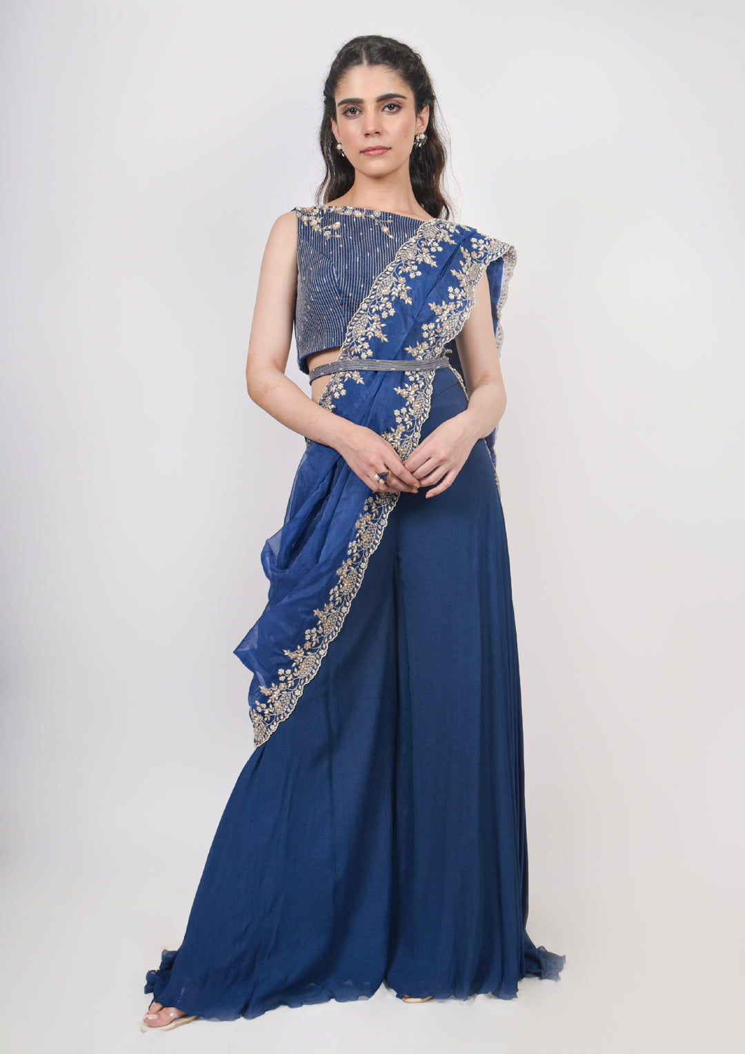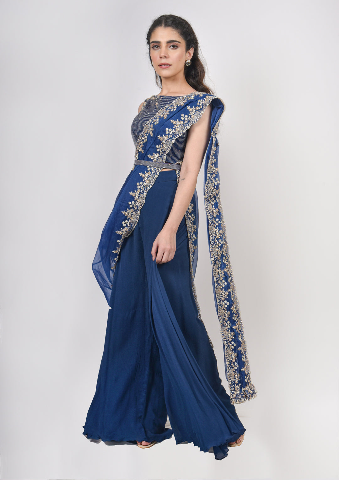Featuring a royal blue crop top, pants and a drape dupatta set embellished with moti, sequence and threadwork paired with a belt. This piece consists of a crop top, pants, dupatta & a belt. Length: top 15", pants 42".