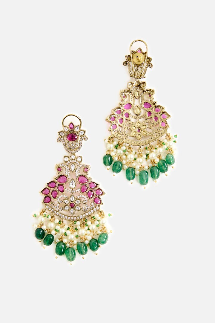 Exquisite chandelier earrings featuring ruby-toned stones, pearl drops, and emerald green beads. A regal statement piece perfect for weddings, festive occasions, and evening celebrations.
