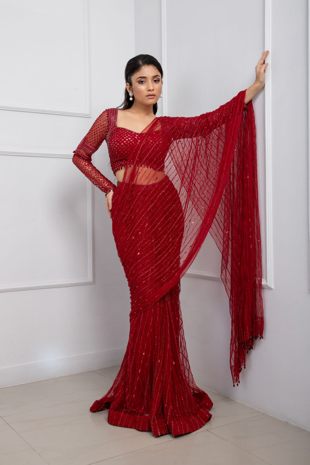 Add jewel tones to your wardrobe with our stunning ruby red drape saree set. It comes with a full sleeve embellished blouse with beaded tassels in the same red hue that complements all skintones.