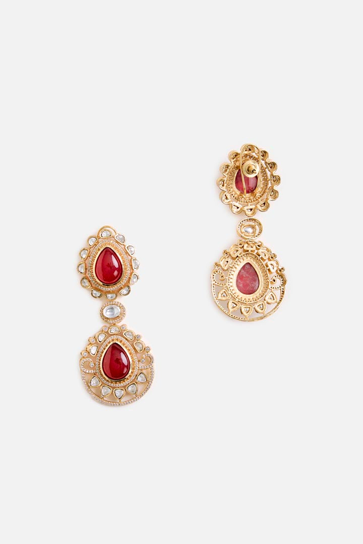 These Ruby Red Statement Drop Earrings showcase bold red stones framed in intricate gold detailing, creating a royal and glamorous look. Perfect for weddings, parties, or festive celebrations.