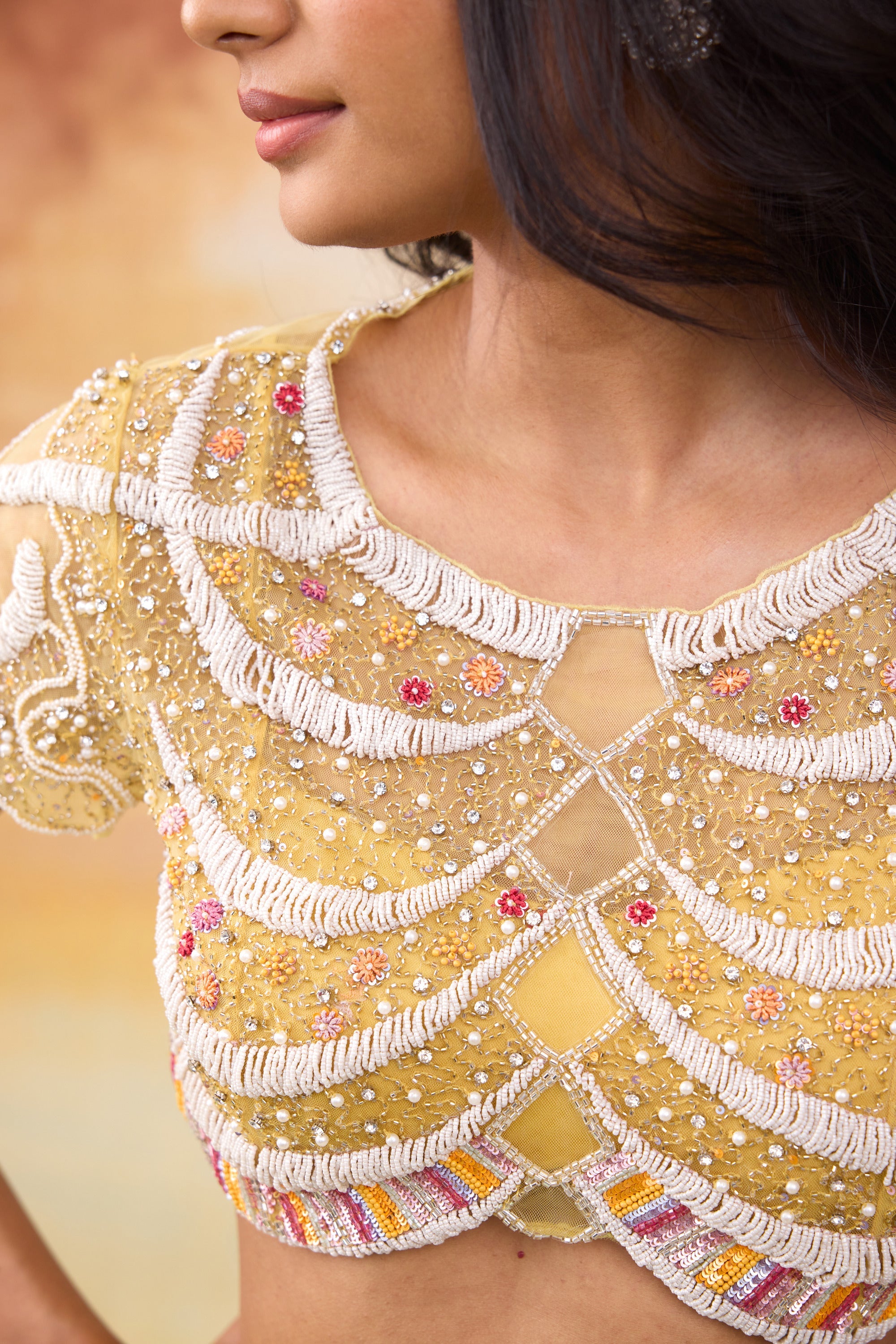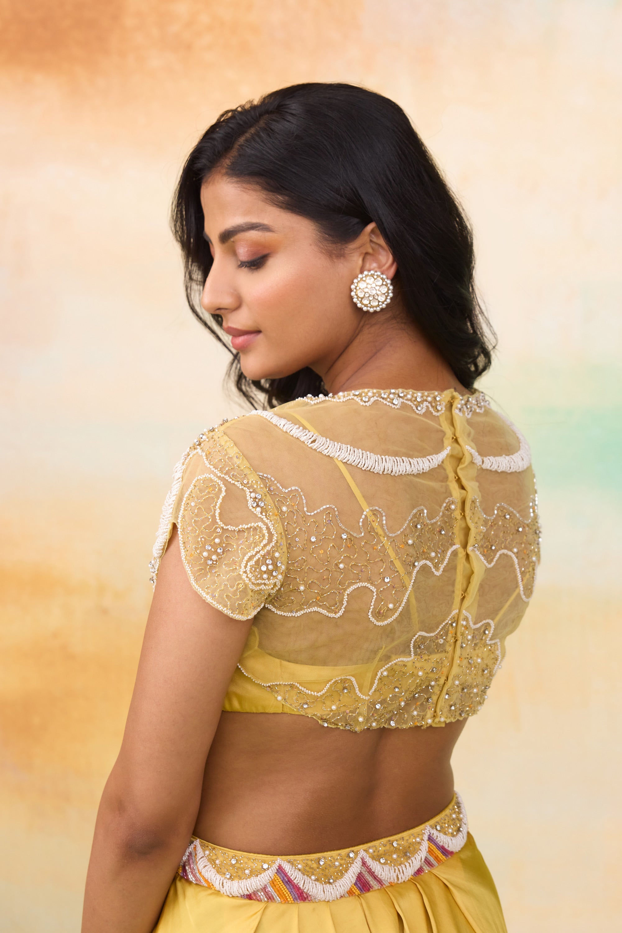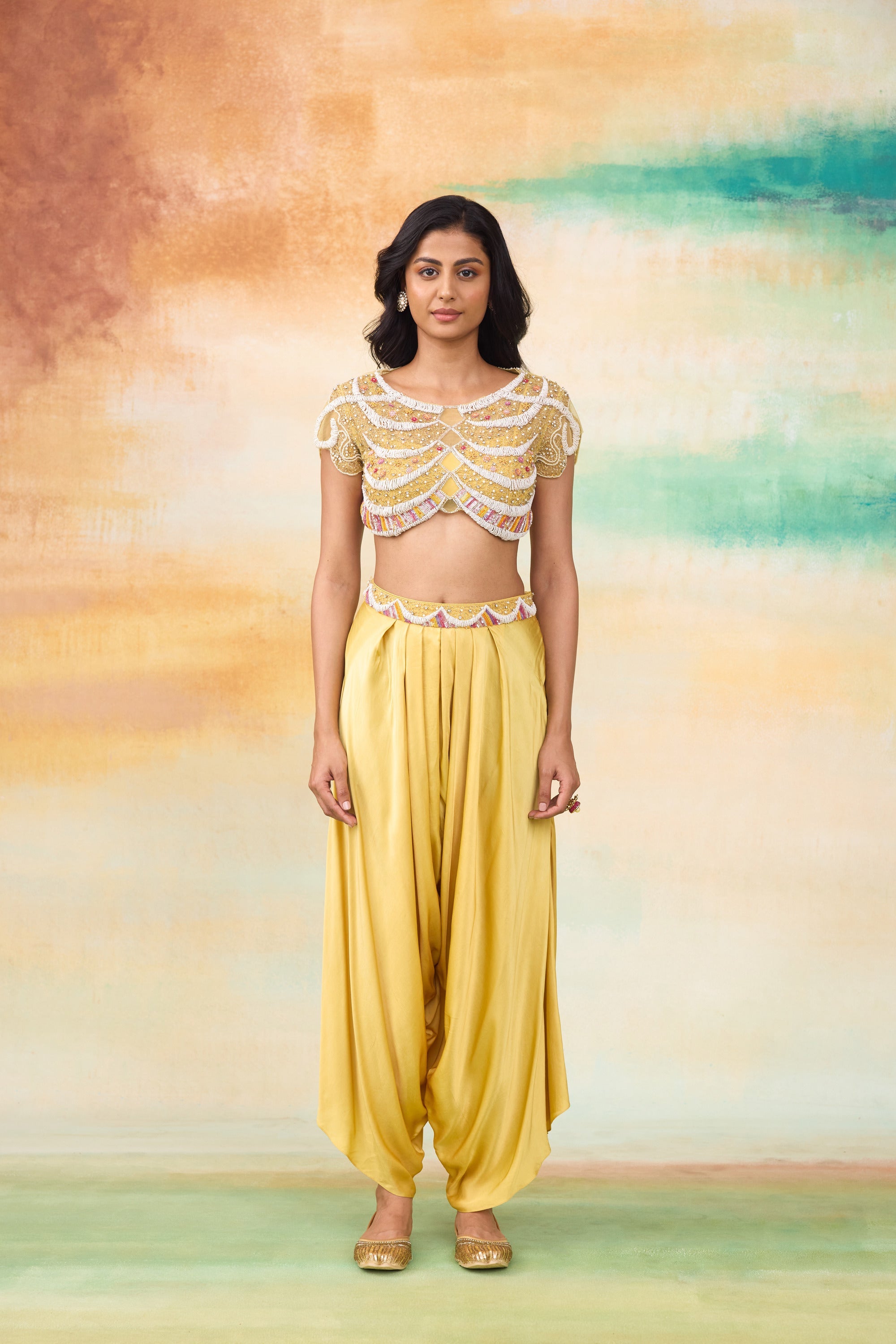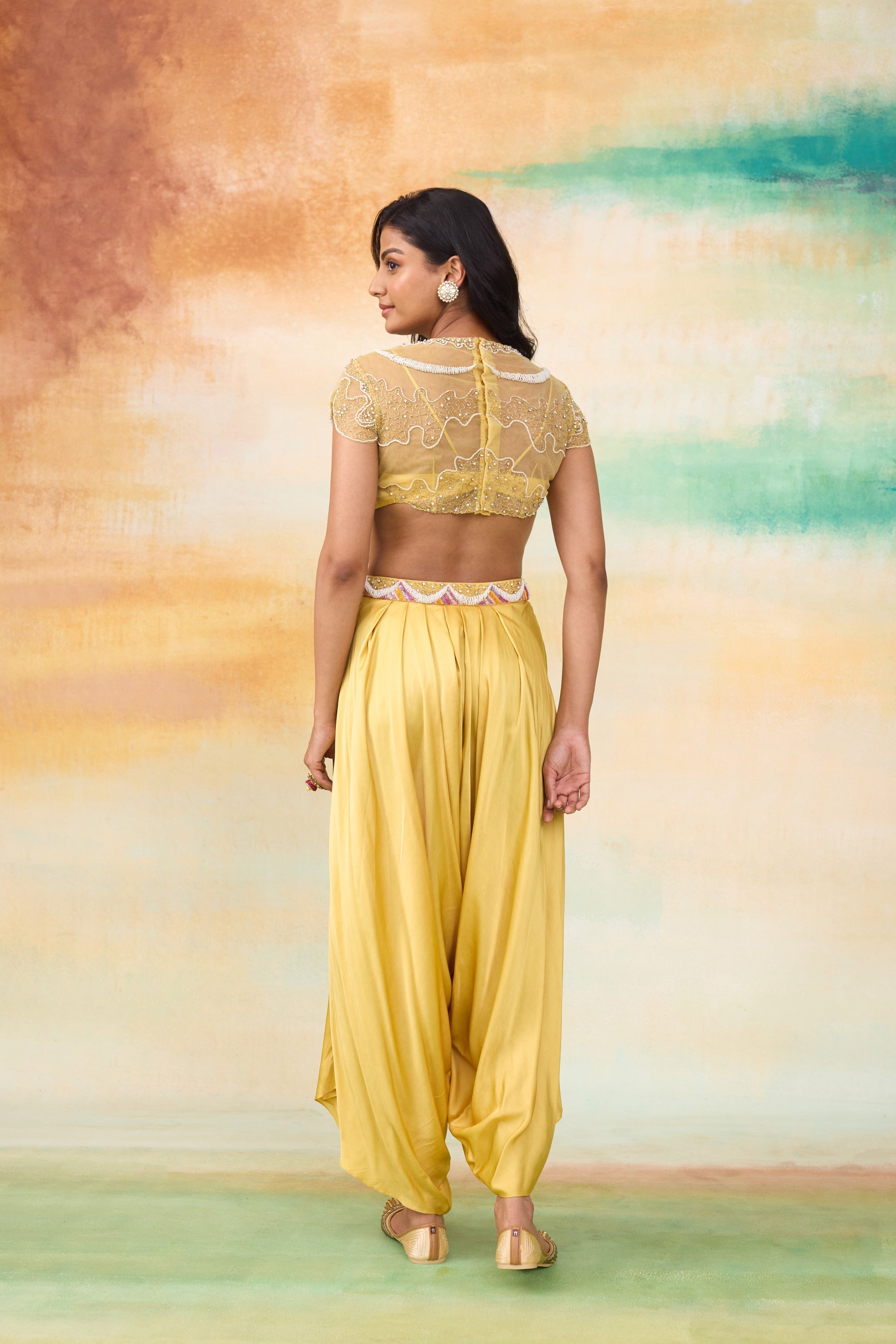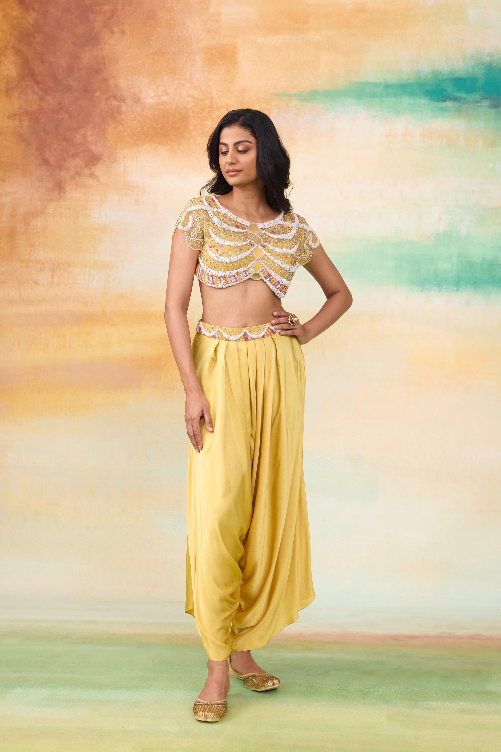 Our Rupenzel dhoti and top set , is a blend of effortless style and elegance. The dhoti is crafted from modal satin paired with a soft net top layered over a sleek modal satin bralette. The top has graceful scallop detailing and delicate floral embroidery motifs , adding a subtle charm. The vibrant sunrise yellow hue makis this outfit stand out, offering a fresh and radiant appeal.