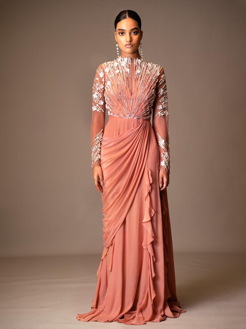 The Aurel Saree Gown is crafted in tulle and silk crepe, blending structure