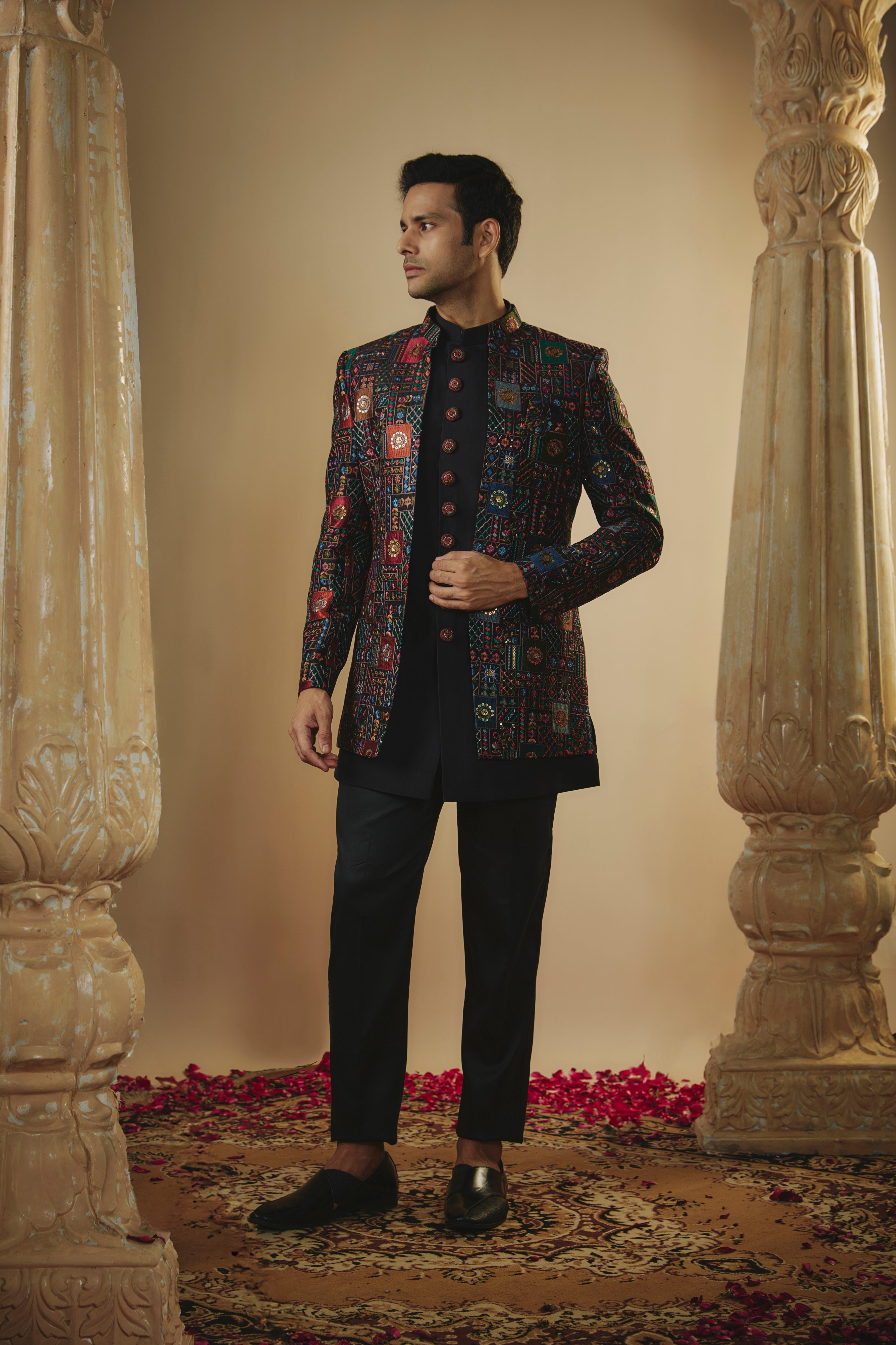 Sable black open jodhpuri set in plain imported fabric with multicoloured resham and sequins work jacket paired with black pants.