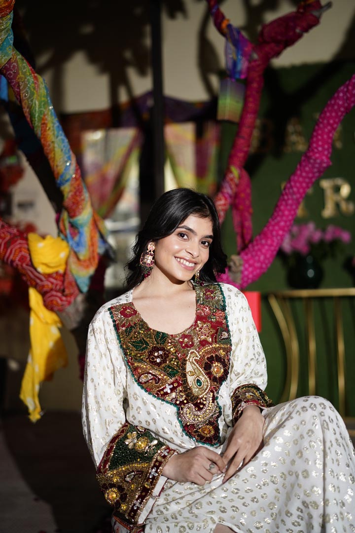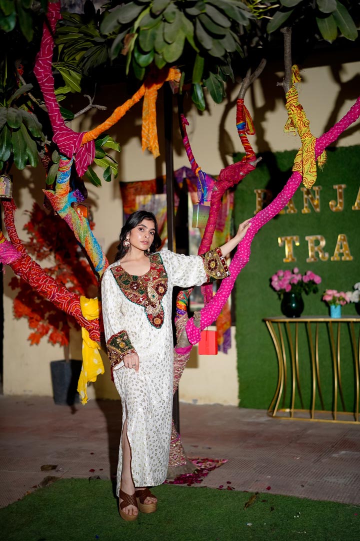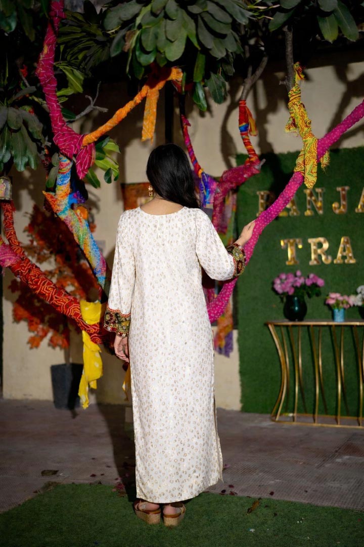 Crafted in fluid georgette with a soft gold foil print, Sadaf-e-Noor is elevated with hand-embroidered, embellished patches that frame the silhouette with quiet opulence. Thoughtfully lined for comfort and fall, it balances ease with occasioneffortless by day, luminous by night.