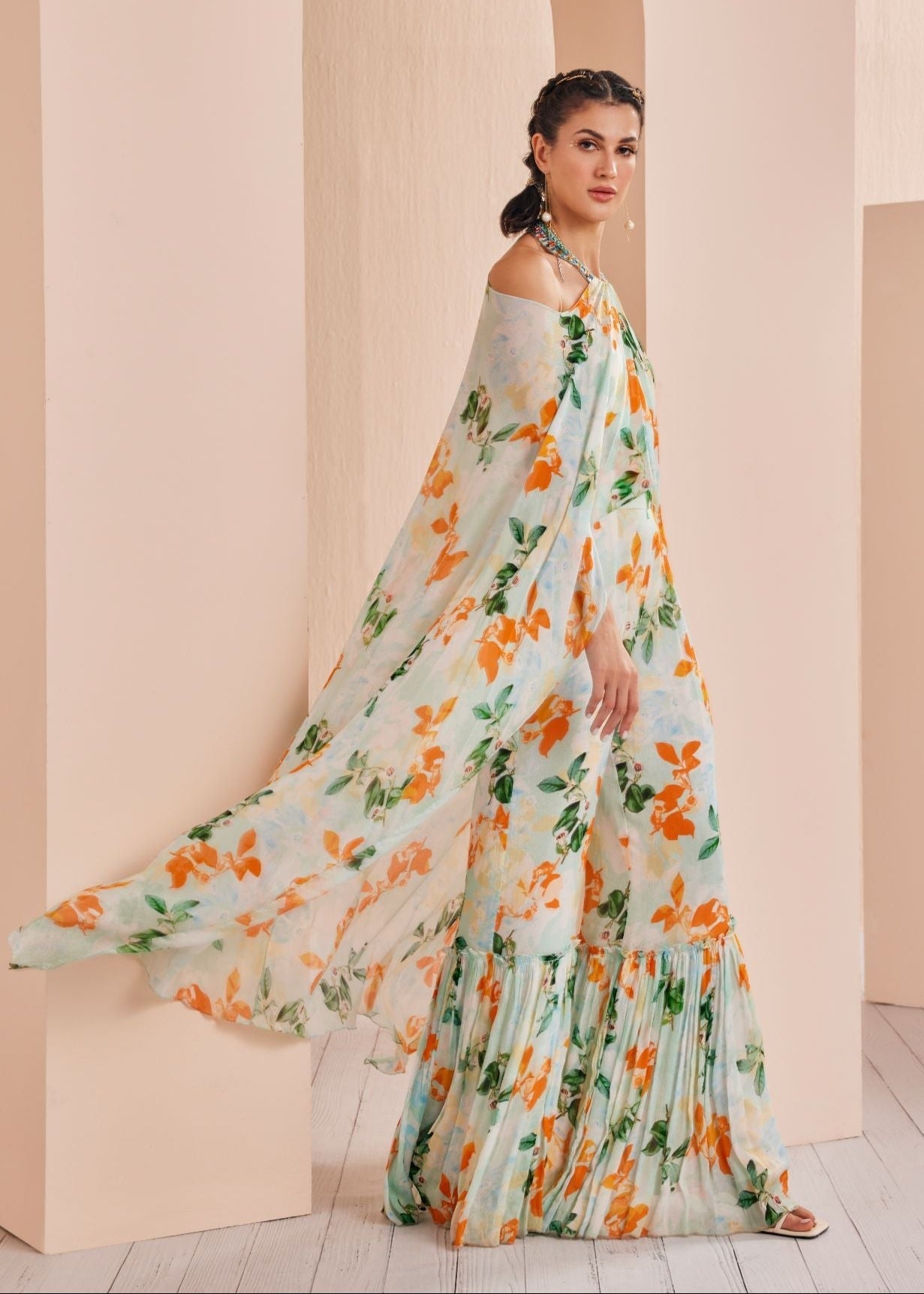 Elevate your style with this printed chiffon jumpsuit, a stunning ensemble that effortlessly blends comfort and sophistication. The jumpsuit boasts a stylishly attached cape with cool, flowing sleeves that exude an air of effortless elegance.
