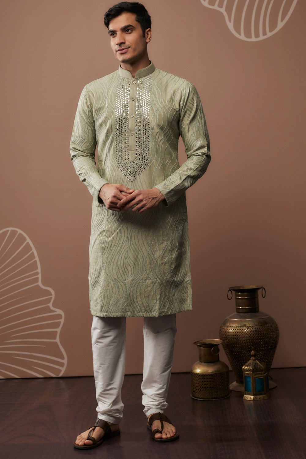 Embrace timeless elegance with the sage green splendid silk kurta set featuring mirror work around the neckline. Paired with prestrine white pajama.
