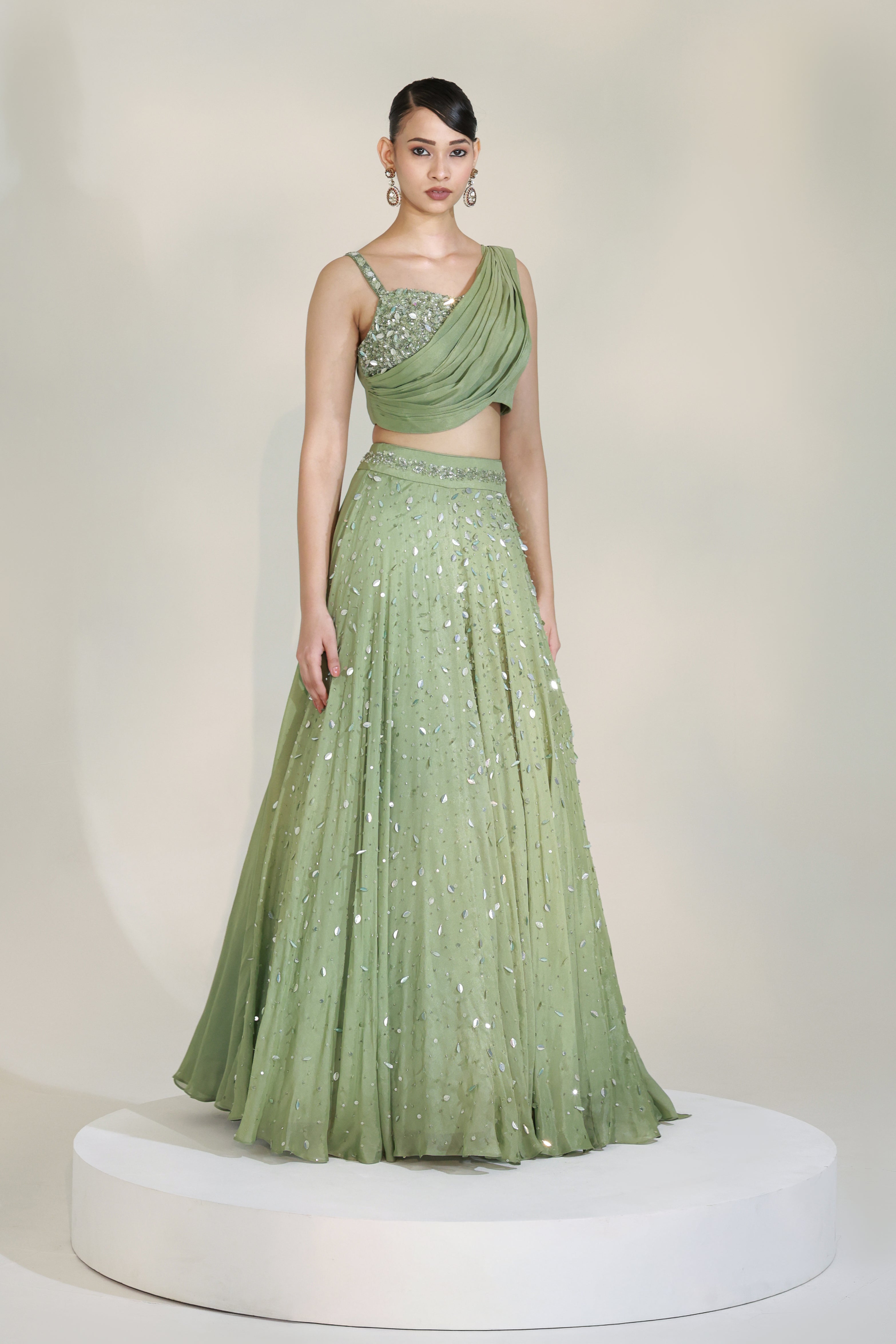 Commanding yet fluid, sage green ensemble is crafted for the modern muse. The hand-embroidered blouse, cinched to perfection, comes with an attached drape that adds effortless movement. Paired with a richly detailed lehenga skirt, every shimmer of threadwork and sequin reflects power, poise, and celebration.