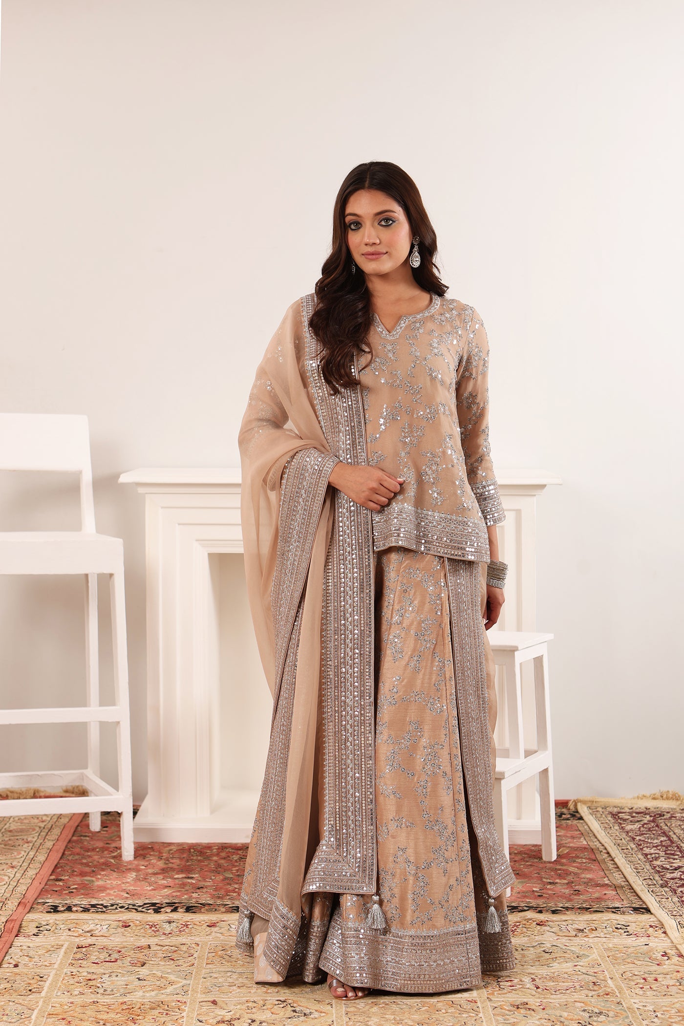 Sand-Beige Embroidered Pure Silk-Organza Short-Kurta-Sharara Set
