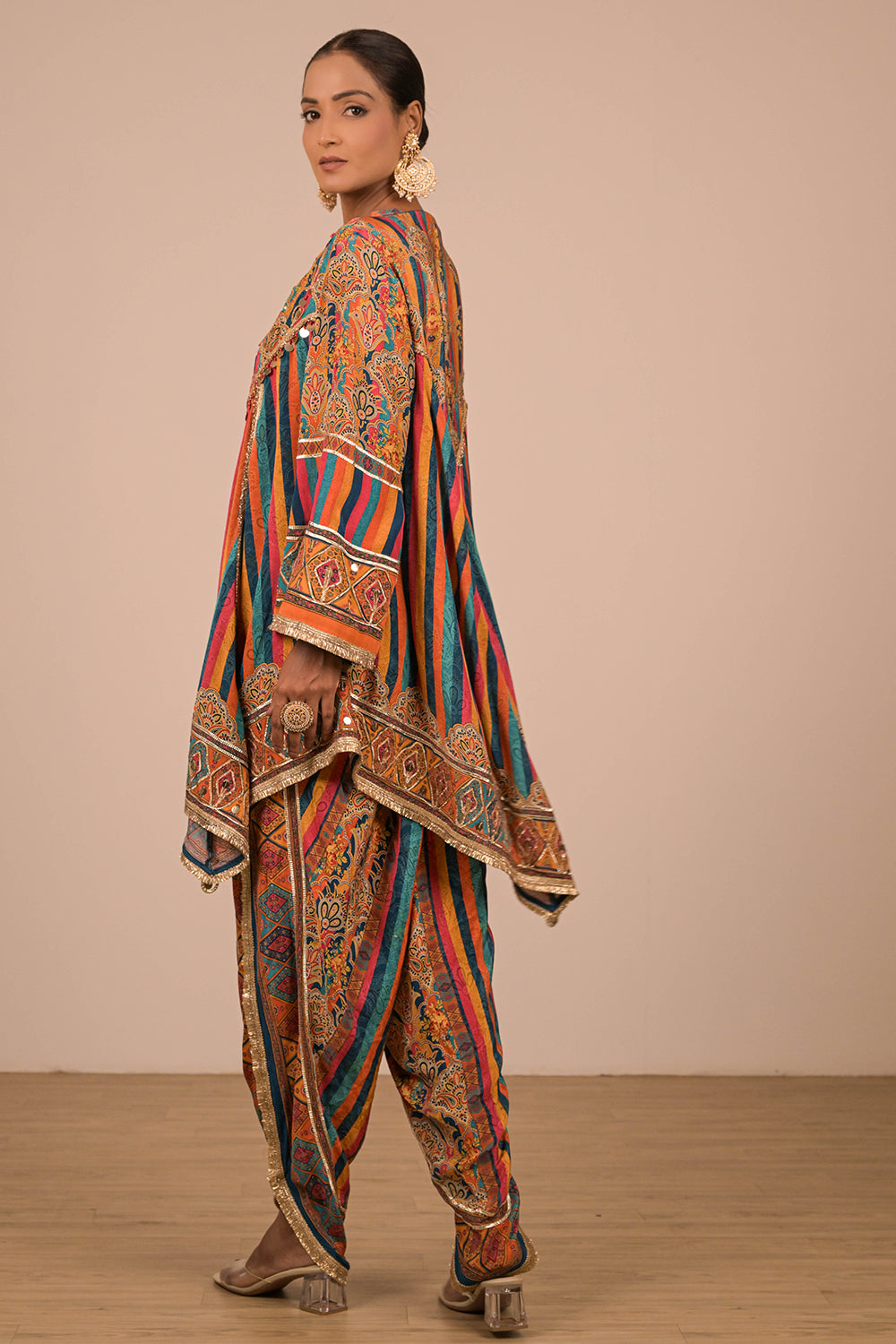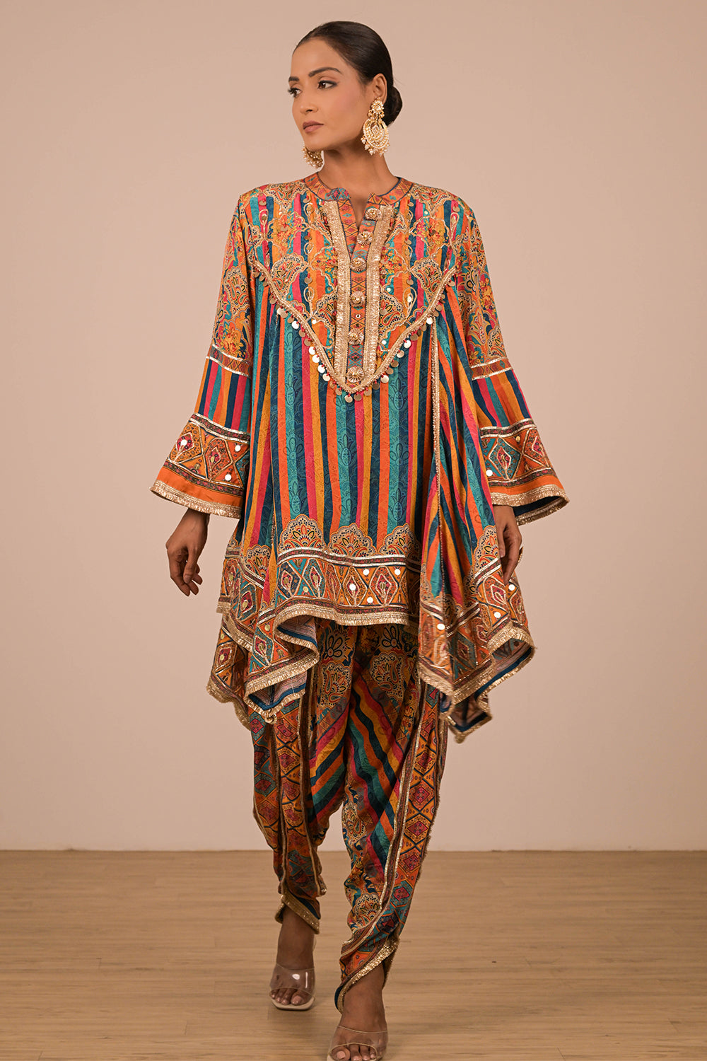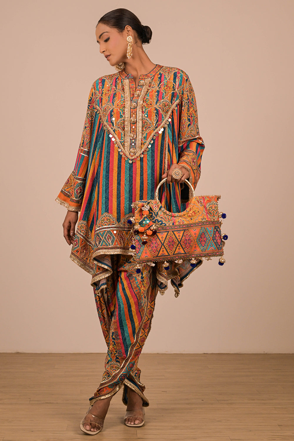 This lively Sapphire Blue crepe suit set is perfect for the modern woman who loves ethnic vibrancy. Featuring a mirror-adorned short kurti and statement tulip pants, the outfit also includes a matching Canvas tote bag enhanced with festive embellishments and tassels. Ideal for wedding celebrations, Navratri, or mehendi functions, this set promises comfort with traditional charm. Pair it with mojris and a bold ring to elevate your complete festive look effortlessly.