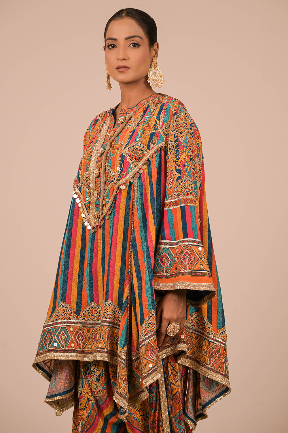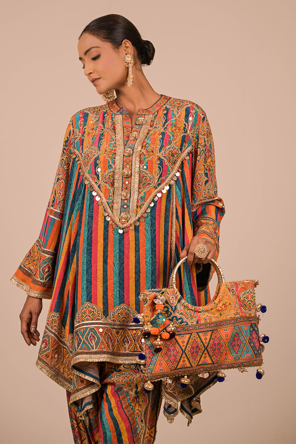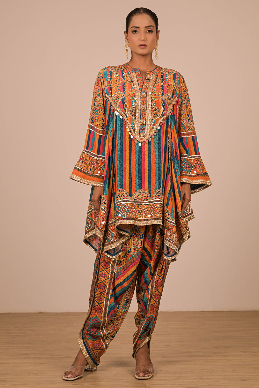 This lively Sapphire Blue crepe suit set is perfect for the modern woman who loves ethnic vibrancy. Featuring a mirror-adorned short kurti and statement tulip pants, the outfit also includes a matching Canvas tote bag enhanced with festive embellishments and tassels. Ideal for wedding celebrations, Navratri, or mehendi functions, this set promises comfort with traditional charm. Pair it with mojris and a bold ring to elevate your complete festive look effortlessly.