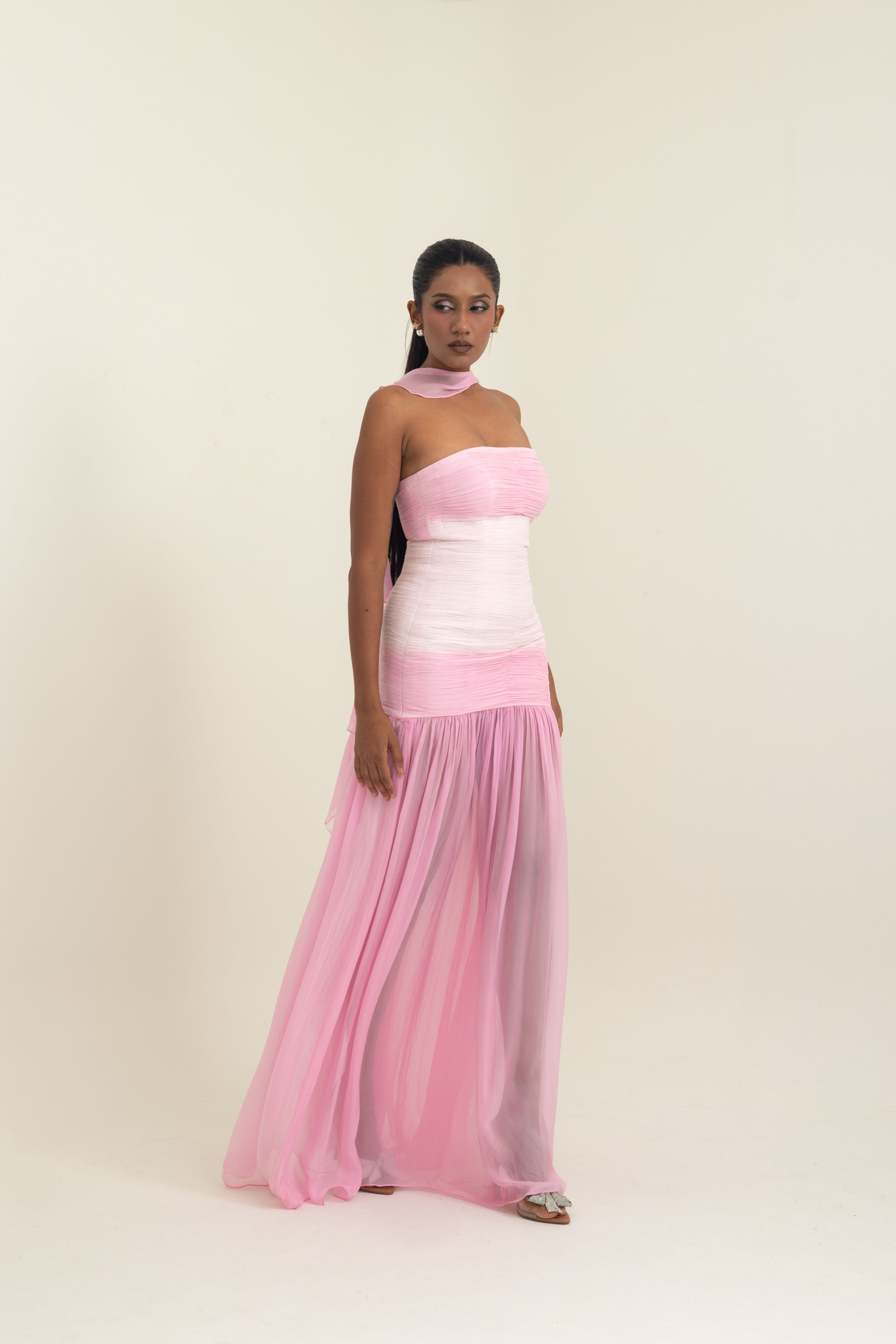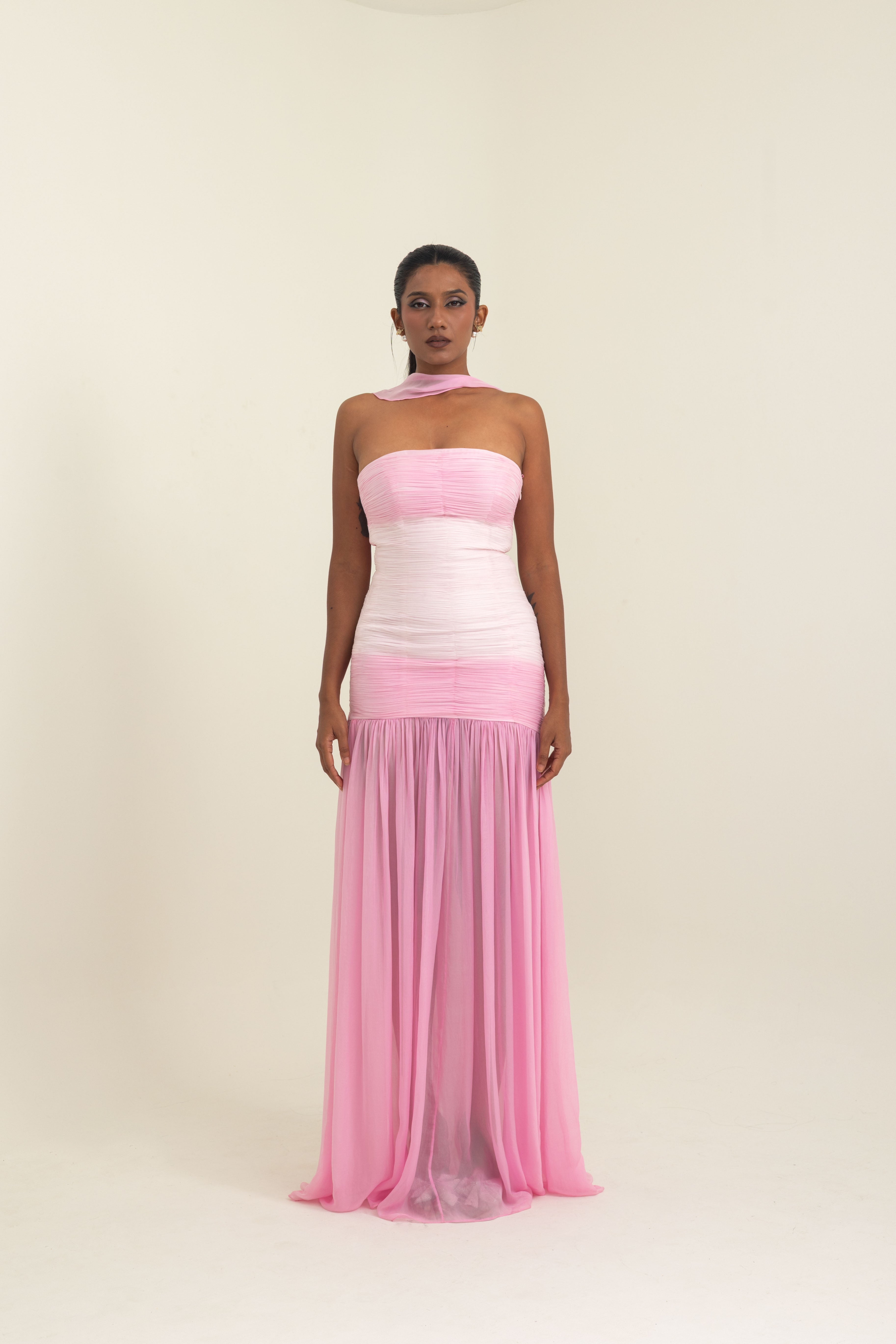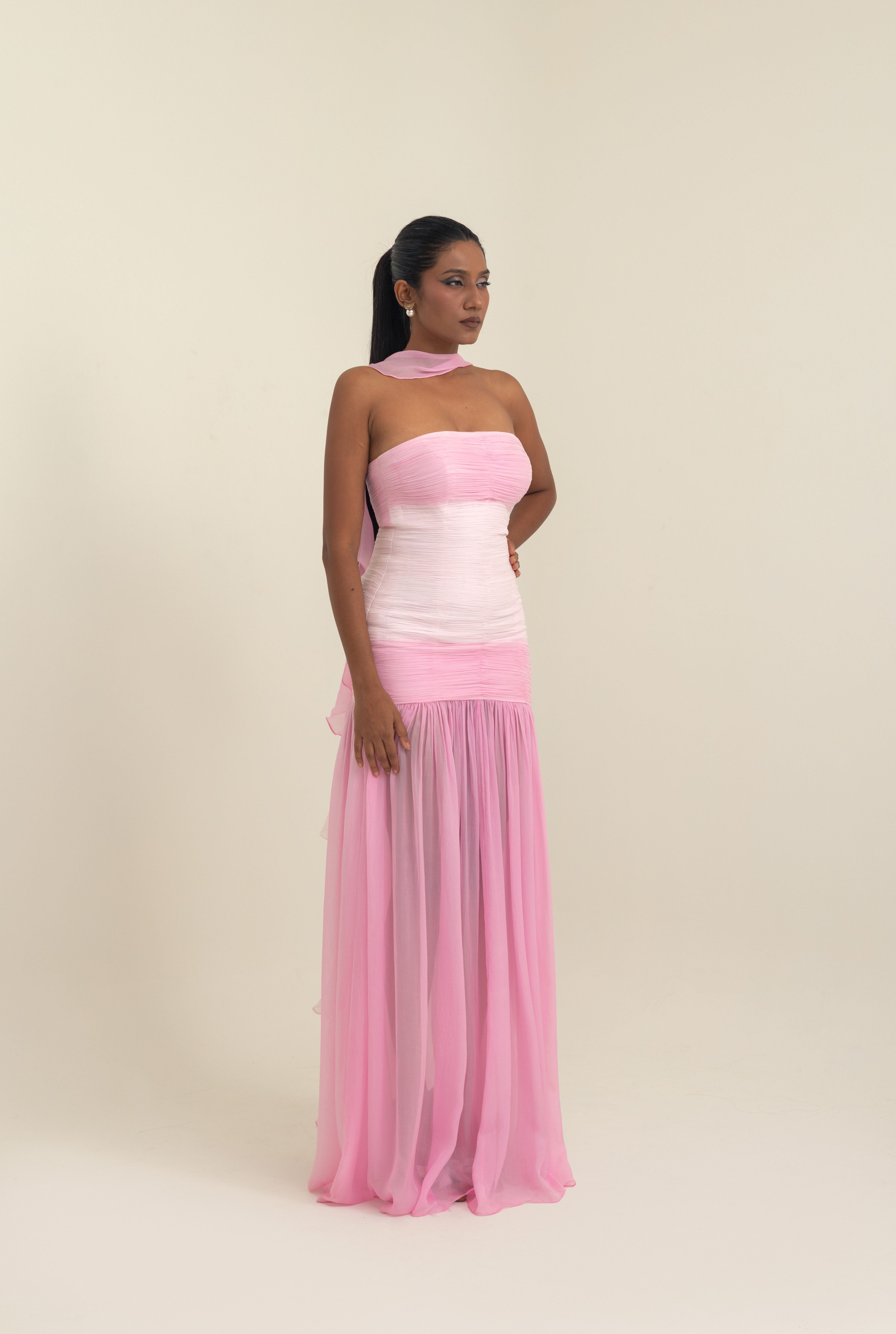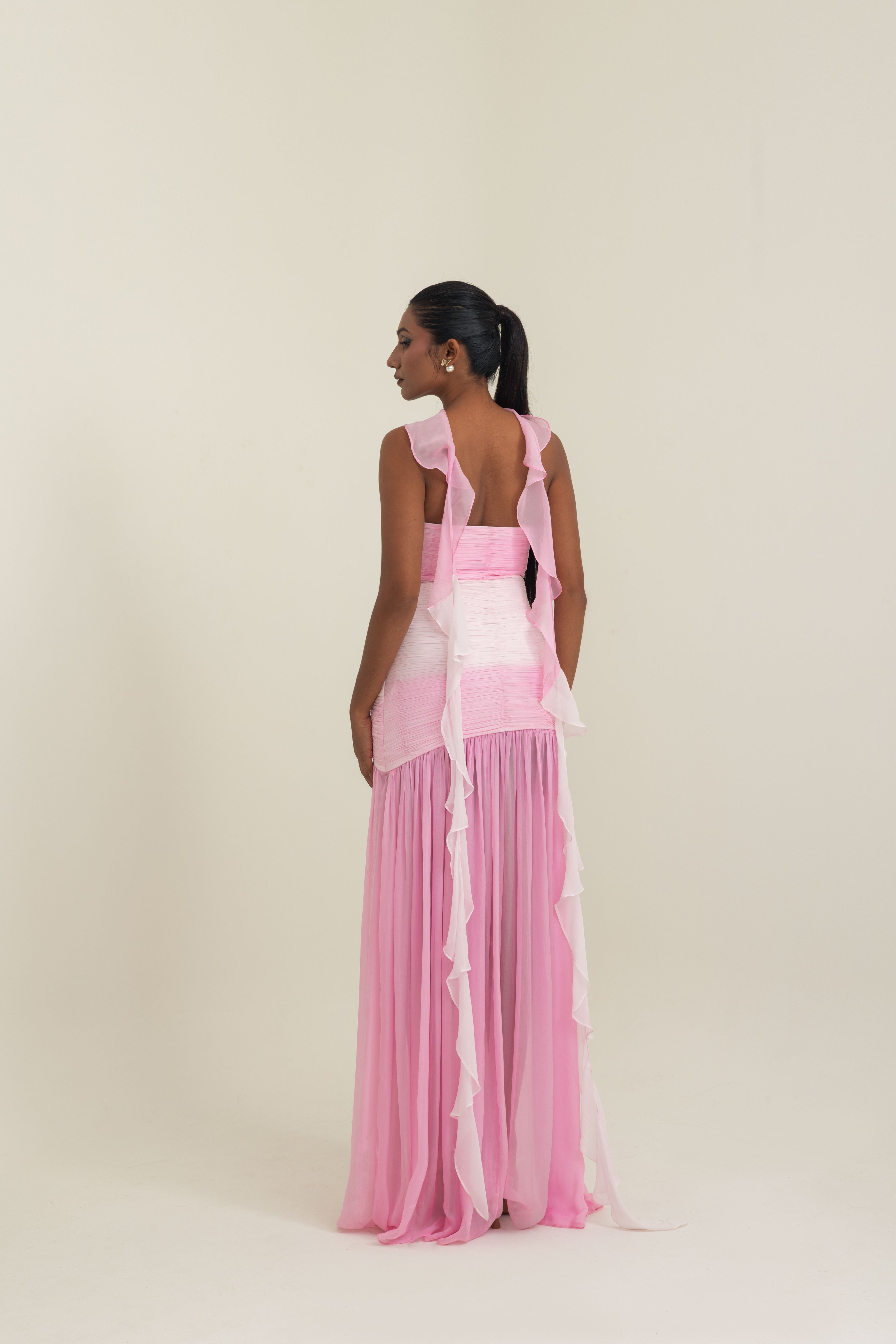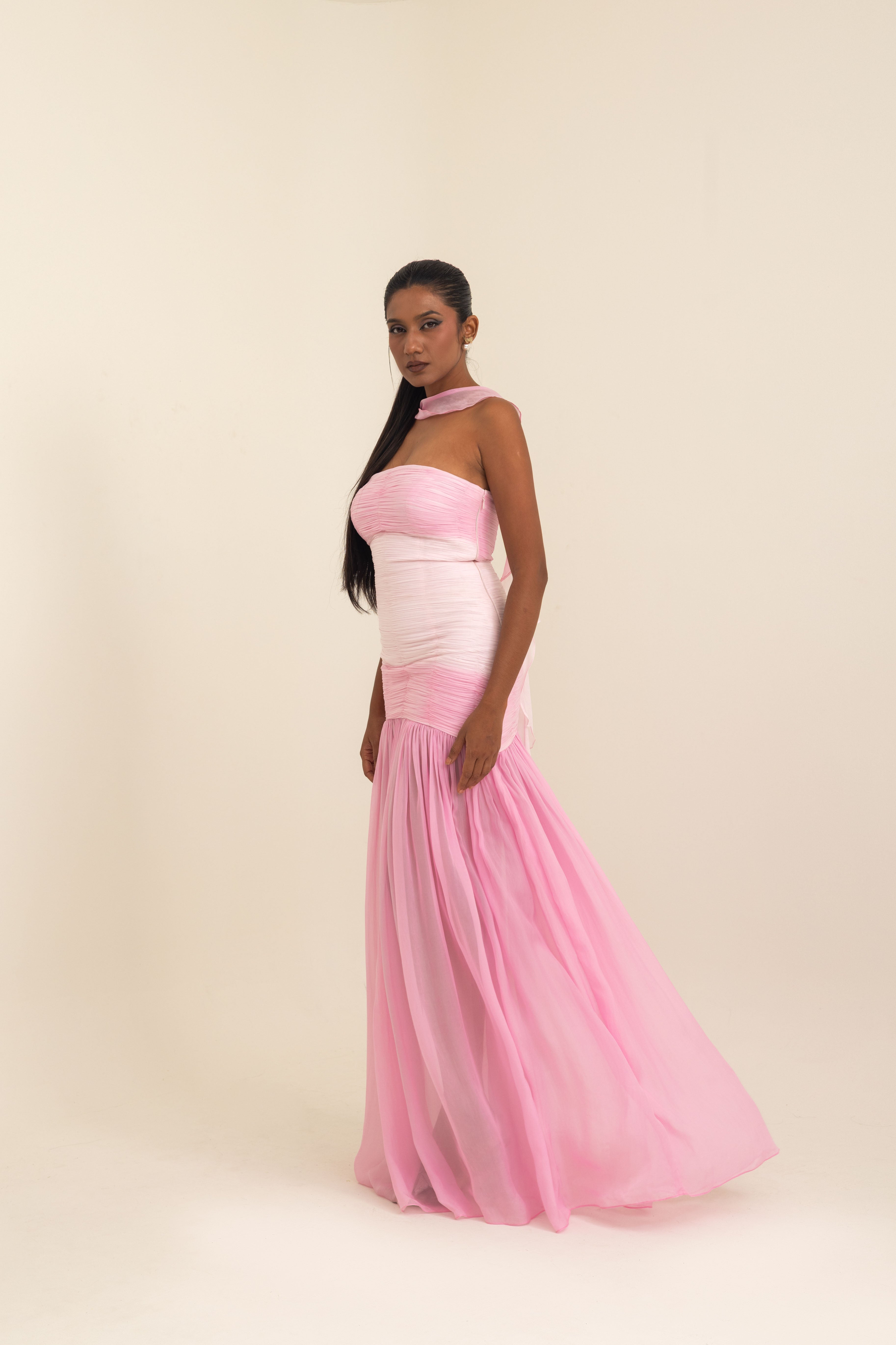 An ode to modern elegance, this gown in shades of pink satin georgette is crafted to embrace fluidity and grace. The off-shoulder neckline is softened with delicate ruching, sculpting the bodice into a romantic silhouette that transitions seamlessly into a flowing sheer-panel skirt. Paired with a whisper-light stole, it adds an ethereal dimension, draping with effortless sophistication.Pink Satin Georgette Off-Shoulder Gown with Stole. Designed to captivate, the gown’s open back detail brings a contemporary allure, making it perfect for red-carpet moments, soirées under the stars, or intimate celebrations. A timeless piece where structure meets softness, creating an unforgettable impression.