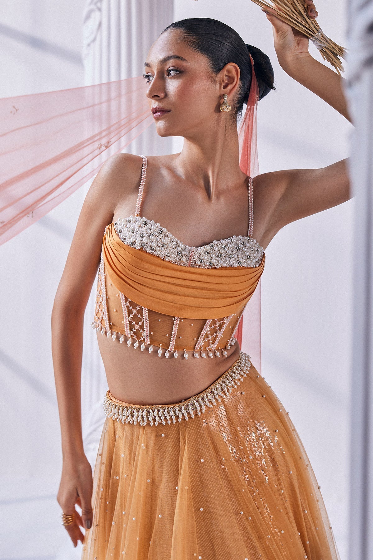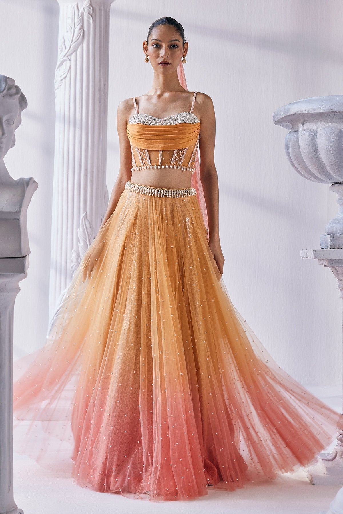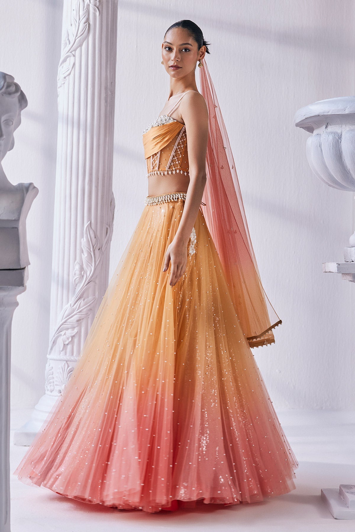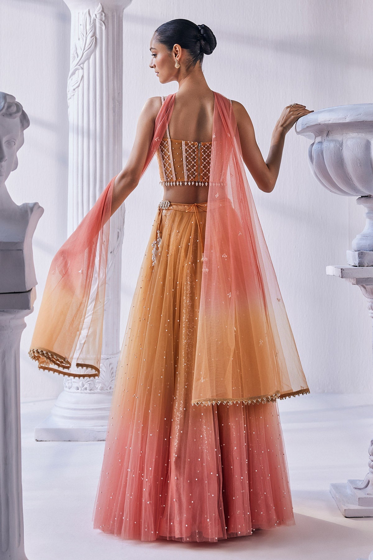 This exquisite satin georgette ombre lehenga adorned with stunning sequin and pearl detailing. The luxurious ensemble is perfectly complemented by a meticulously crafted beadwork corset. Complete the look with a matching belt and dupatta.