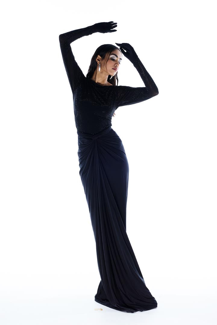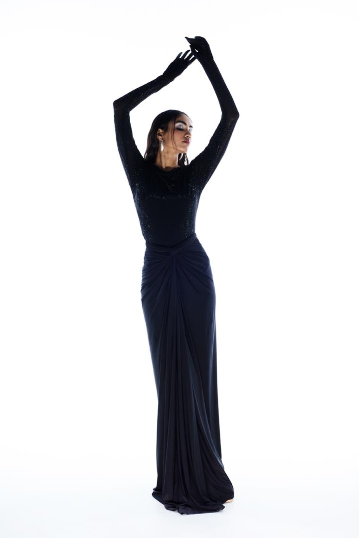 A two-piece set featuring a shimmering, long sleeve bodysuit with attached gloves paired with draped front knot skirt. Prefect for after parties, bachelorette parties.