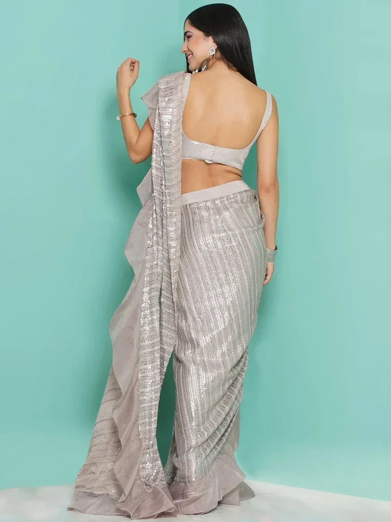 Steel blue sequin, organza saree drape worn with sequin blouse.